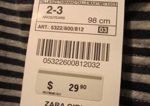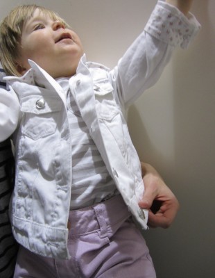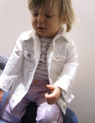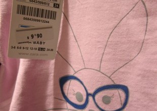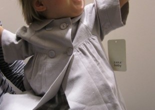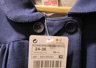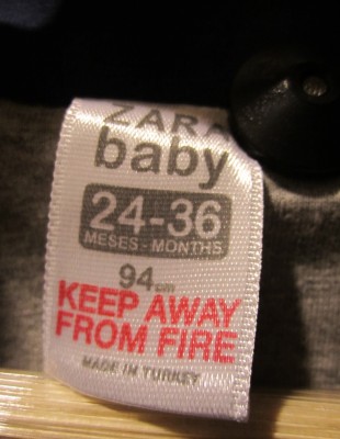 Petit point inquiétant, lire sur les étiquettes keep away from fire. Primo, merci de nous le dire car on allait justement mettre le bébé tout près du feu. Secundo, Sophie m’expliquait que les vêtements pour bébés sont réglementés par rapport à ça et qu’ils ne doivent pas être constitués de matières méga-inflammables comme ça semble être le cas de certains morceaux chez Zara…