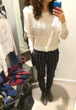Look 1 : j’aime le tricot léger avec un petit 58 en paillettes pas trop clinquant que j’ai hâte de porter avec des shorts de jeans et j’ai adopté les pantalons noirs a carreaux blancs.