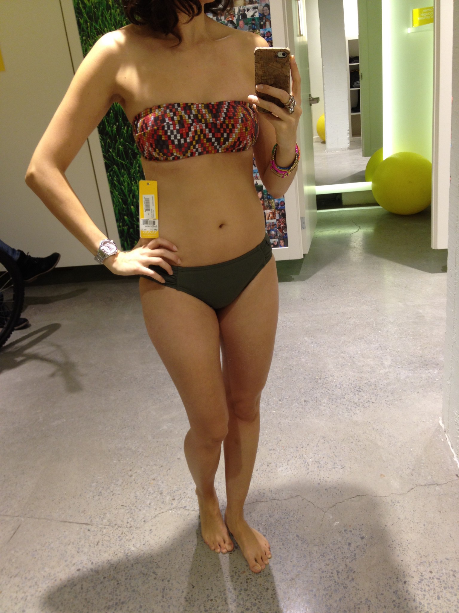 Finalement, les nouveaux maillots de bain étaient entrain d’arriver à l’Atelier alors je n’ai pas pu résister à la tentation d’en essayer quelques uns même si ça peut parfois être une torture épouvantable. Je dois avouer que Lolë a fait ses devoirs et a compris les subtilités de la silhouette féminine. Mes 2 préférés qui se méritent une place sur le blogue (ouf) sont le one-piece rayé qui est aussi bien conçu pour être jolie que pour être sportive avec le croisé dans le dos. Il est fait pour la femme et non pour la silhouette de type mannequin qui veut montrer beaucoup de peau. hihi Il monte assez haut dans le dos pour cacher notre petite réserve de gras hivernale et grâce aux petites cordes au bas du maillot vous pouvez décider de montrer ou de cacher certaines parties de votre anatomie. Pour la photo, j’ai bien sûr opté pour la version cachée. Et finalement autre coup de coeur pour le maillot mix and match avec le bandeau dans le haut et la culotte kaki dans le bas. Simple et efficace :)