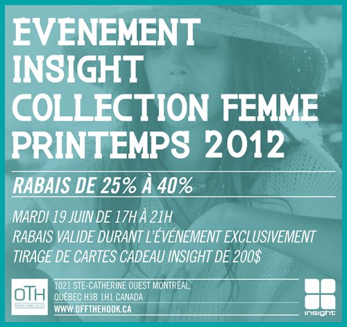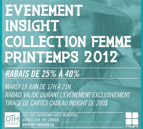 Prenez la soirée du 19 juin en note car c’est à ce moment que vous pourrez vous rendre chez Off The Hook et vous procurez tout plein d’articles de la marque Insight (pour femmes) de 25 $ à 40 % de rabais. Courez aussi la chance de gagner une carte-cadeau Insight de 200 $. Tout ça entre 17h00 et 21h00 le 19 juin.
