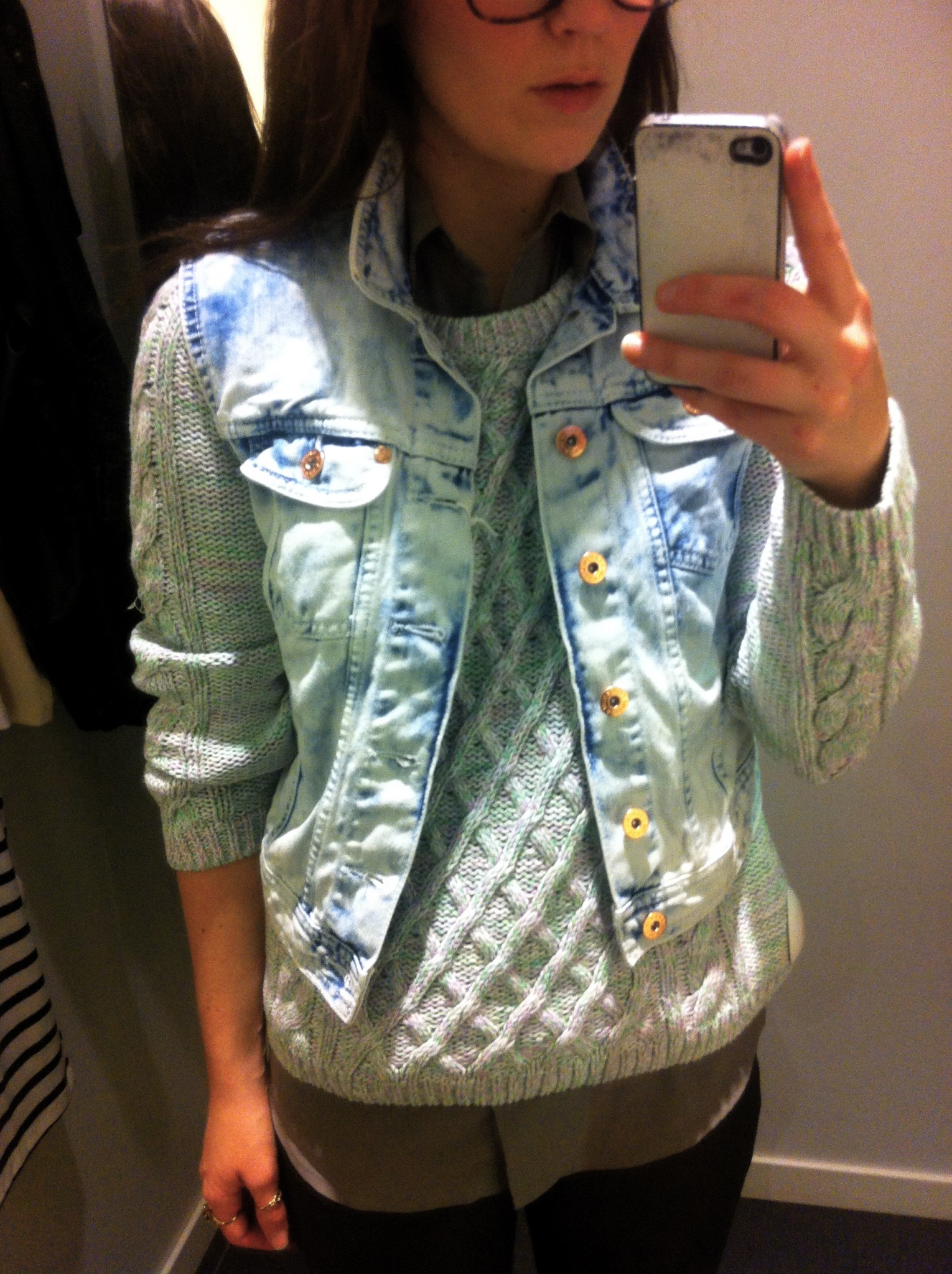 J’ai également combiné la veste en jeans avec un pull pastel (20 euros) afin de créer un ensemble plus sage.