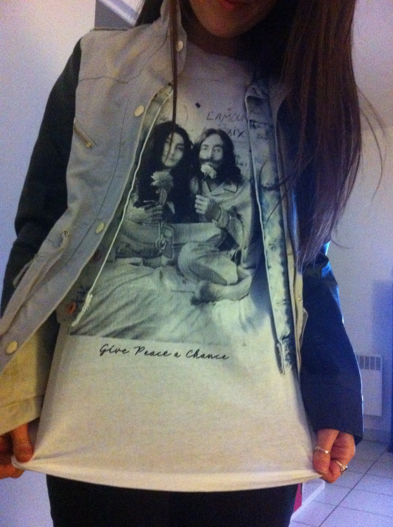 D’ailleurs, celui de John Lennon et Yoko Ono (10 euros), aperçus lors d’une session de flânage dans la section homme, a conquis l’hippie en moi. Combiné à une petite veste de jeans, il semble encore plus parfait, comme s’il attendait un voyage à Liverpool.