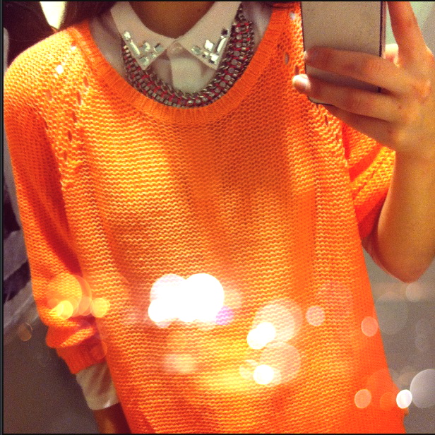Sinon, les couleurs flash qui bombardaient la boutique ont fini dans ma cabine avec un knit orange (30 euros) et un collier rose électrique (15 euros). Combiné à une chemise blanche au collet scintillant, cet ensemble pré-summer peut être porté avec un jeans en léopard saumon (40 euros). Pour un look automnal, le jeans peut aussi être remplacé par le combo jupe en cuir et collants.