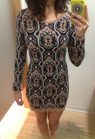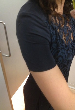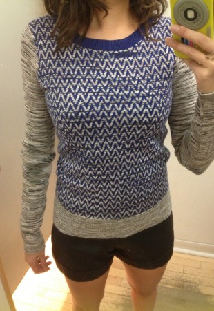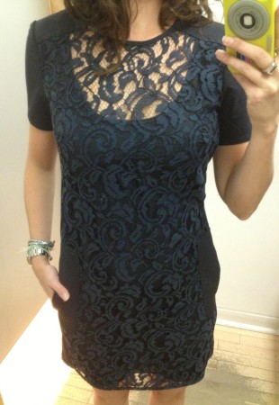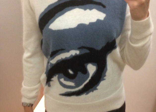 ce n’est plus un secret, j’aime french connection d’amour, mais seulement quand c’est en rabais, comme maintenant. Dans la cabine avec moi des robes, des robes, des tricots encore des tricots. En ordre d’essayage, j’ai bien aimé la robe noire en dentelle mais vous devez avoir un bras microscopique pour ne pas vous sentir inconfortable comme moi en bougeant les bras (photo à l’appui), ensuite la robe en tricot, jolie et ultra-confo mais trop moulante pour mon confort perso et la robe de soie marine à coupe parfaite (à la marie-soleil michon) qui sera un passe-partout parfait pour l’été une fois bien accessoirisée. Ensuite du côté des tricots, je n’ai pu résisté au mélange harmonieux de gris et cobalt et à l’œil.