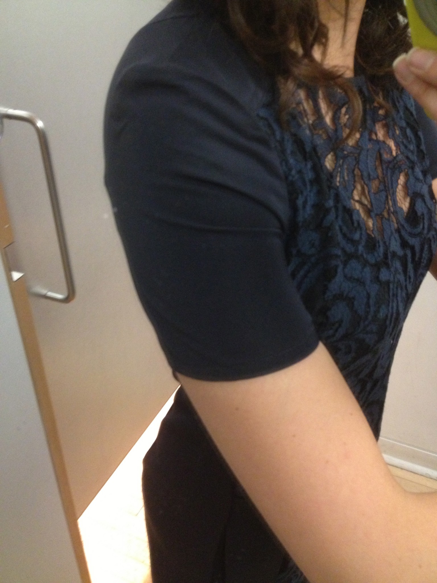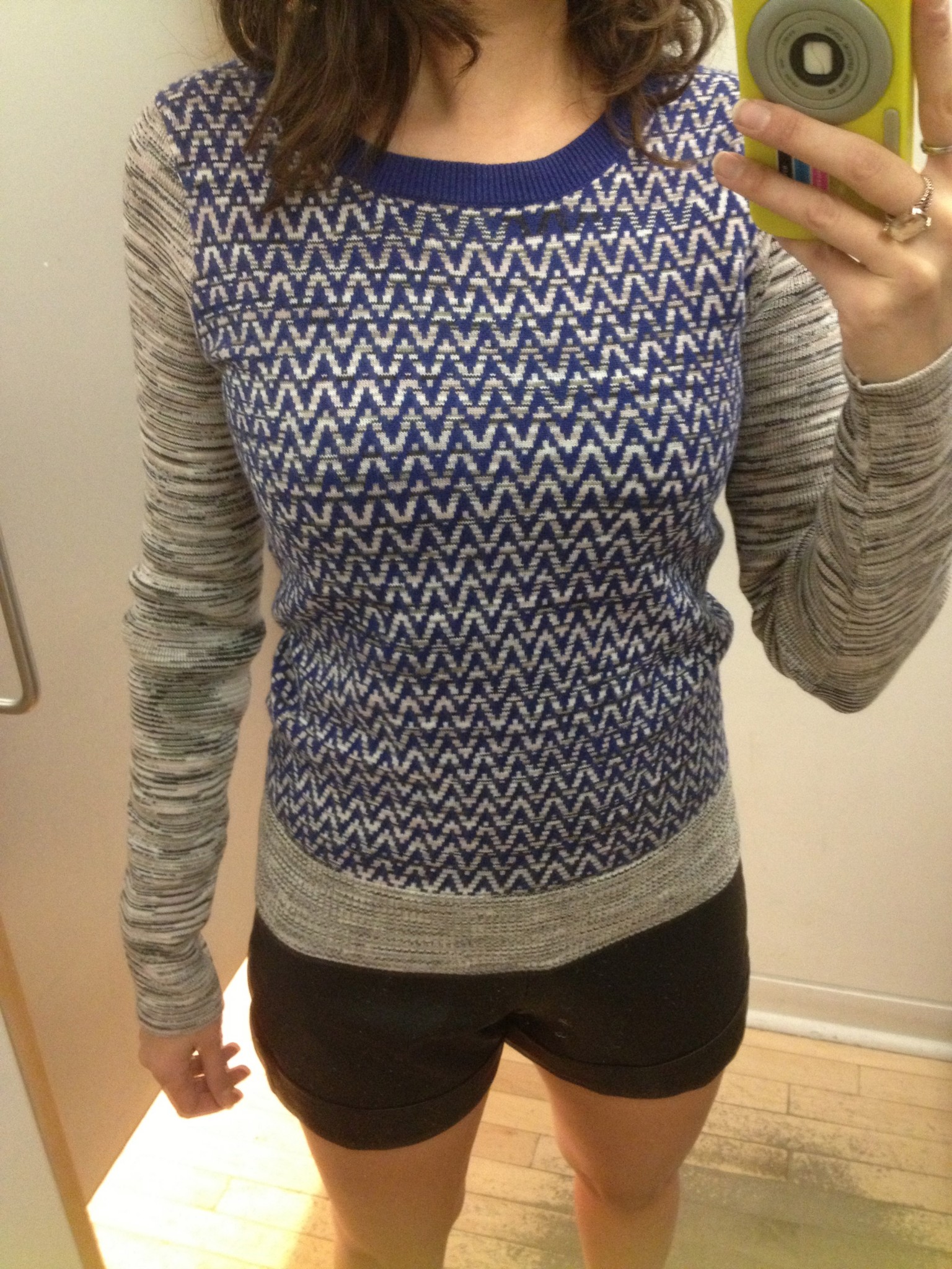 ce n’est plus un secret, j’aime french connection d’amour, mais seulement quand c’est en rabais, comme maintenant. Dans la cabine avec moi des robes, des robes, des tricots encore des tricots. En ordre d’essayage, j’ai bien aimé la robe noire en dentelle mais vous devez avoir un bras microscopique pour ne pas vous sentir inconfortable comme moi en bougeant les bras (photo à l’appui), ensuite la robe en tricot, jolie et ultra-confo mais trop moulante pour mon confort perso et la robe de soie marine à coupe parfaite (à la marie-soleil michon) qui sera un passe-partout parfait pour l’été une fois bien accessoirisée. Ensuite du côté des tricots, je n’ai pu résisté au mélange harmonieux de gris et cobalt et à l’œil.