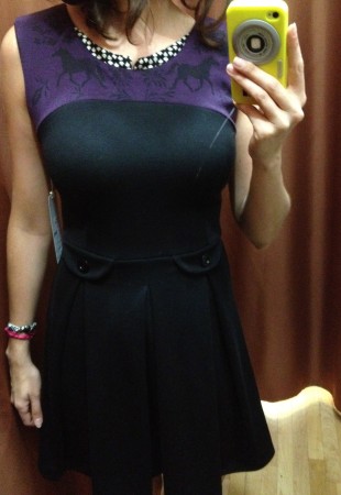 3) J’ai fait la découverte de la designer Ève Lavoie. J’ai aimé la coupe de la robe qui définit super bien la taille et donc la silhouette féminine. Étant aussi artiste, elle reproduit certaines images sur ses robes et jupes, comme les chevaux dans le cas présent.