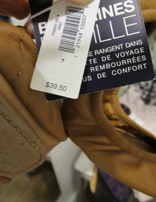 – les ballerines que l’on peut traîner dans le sac à main pour éviter de porter la pantoufle en phentex chez votre hôte ou hôtesse (ceci dit, je n’ai rien contre la pantoufle en phentex…) (39,50 $)