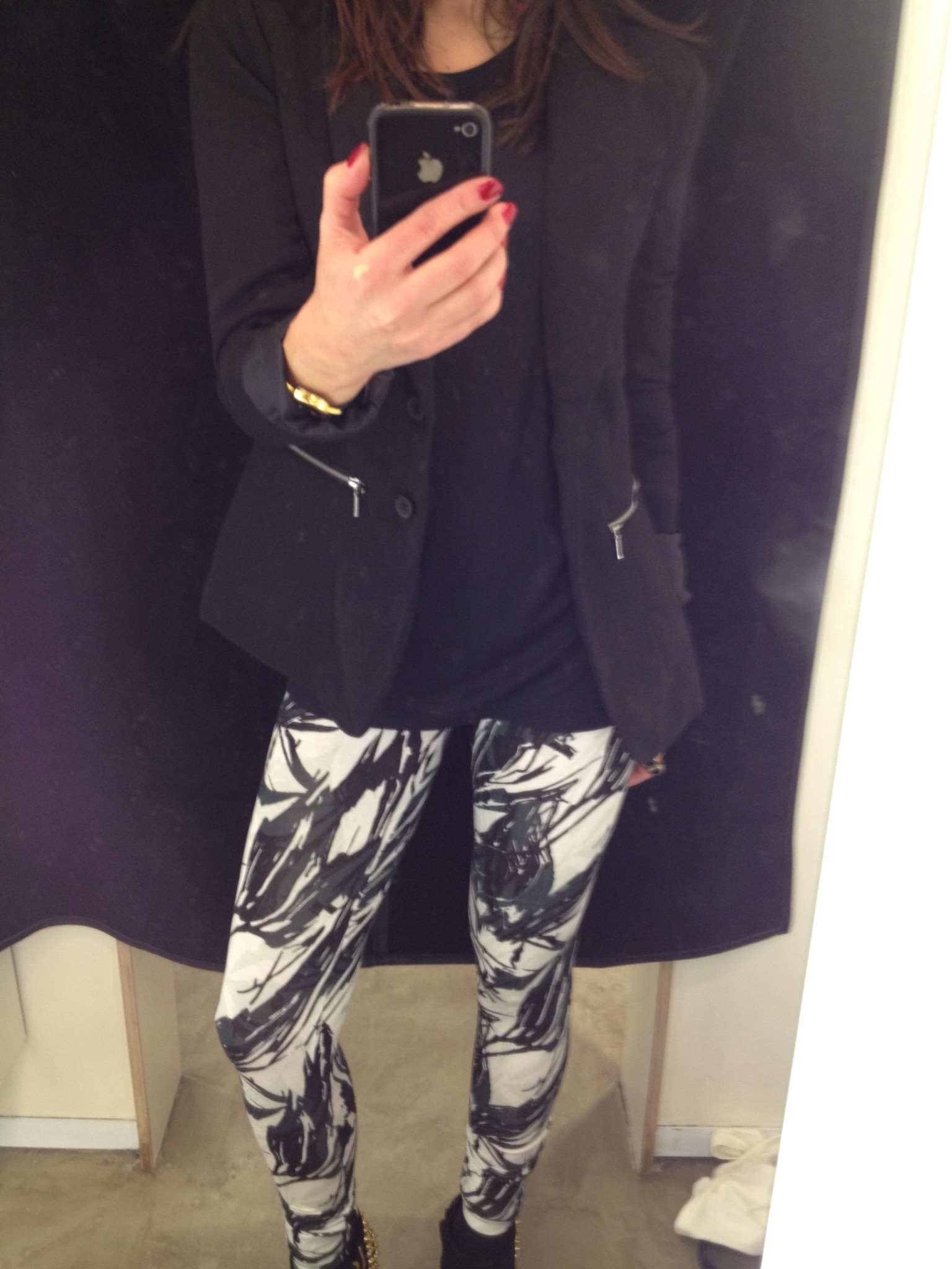 Les leggings imprimés font un très beau look quoique un peu trop funky pour moi!;) Les jeans imprimés noir et blanc sont aussi très beaux, à noter qu’ils sont de coupe taille haute.