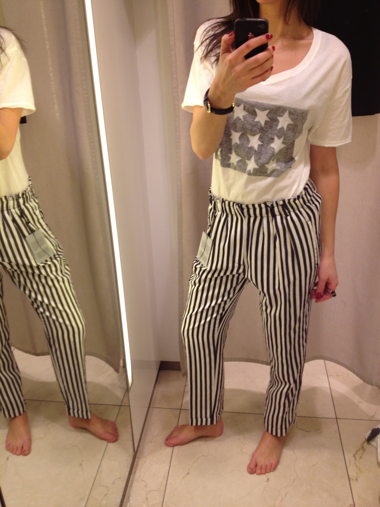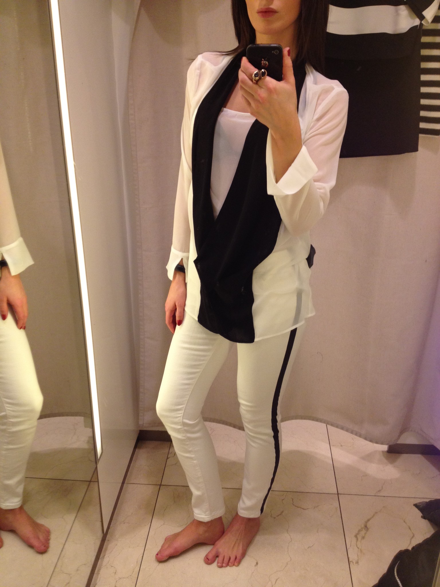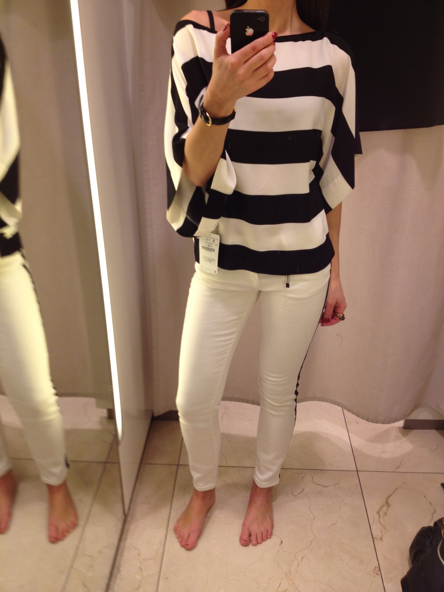 J’ai adoré la chemise cache-coeur rayée noire et blanc et les jeans blanc à ligne noire qu’on retrouve un peu partout. (Nathalie en a essayé un modèle similaire chez Forever 21.)