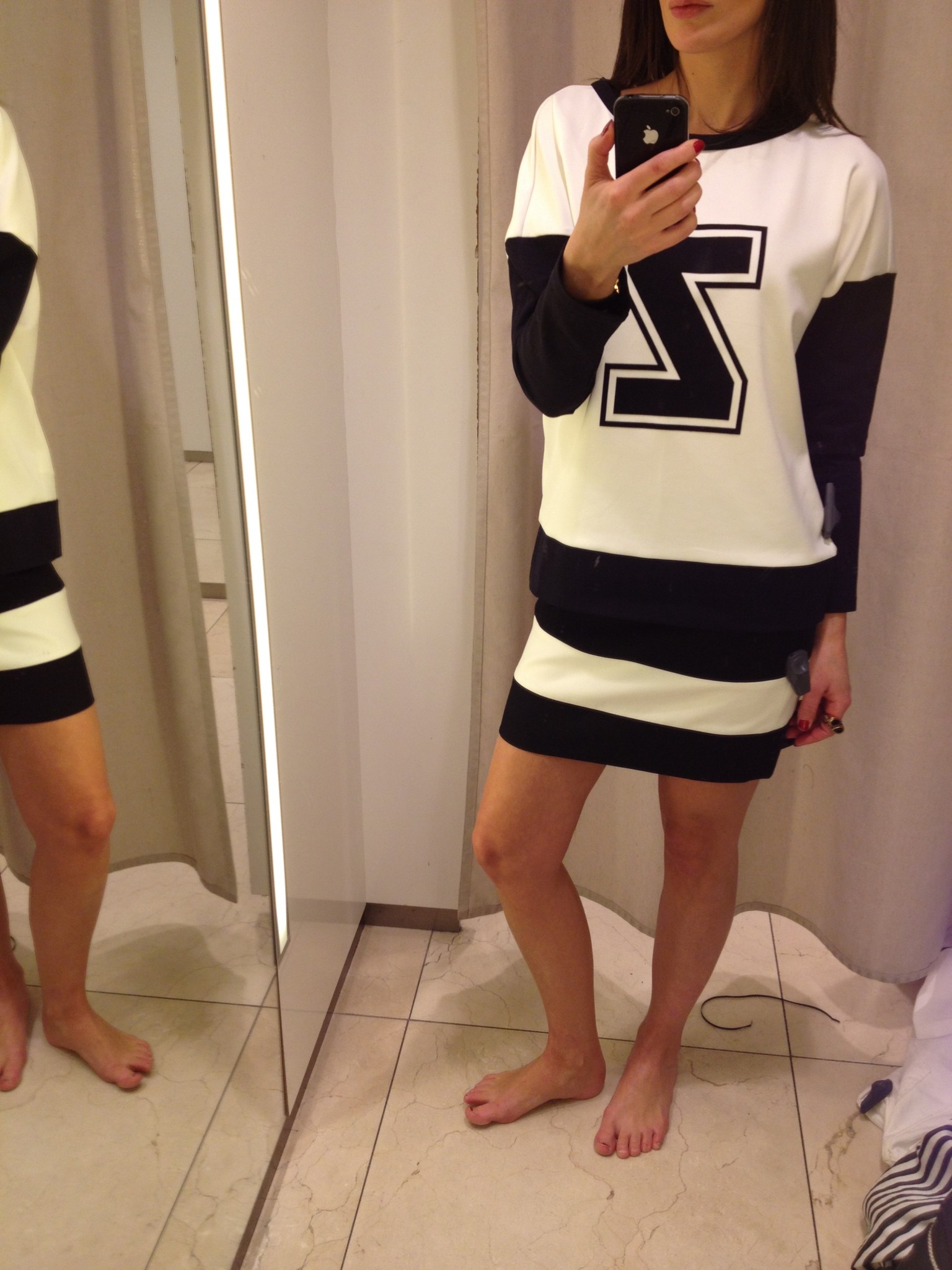 Et côté look un peu moins réussi, il y a moi dans des pantalons à rayures verticales style “dayjama”. Ouf! Bon disons que ça ne va pas à tout le monde! Et même chose pour le jersey sport noir et blanc qui me donne un look de joueuse de football:(