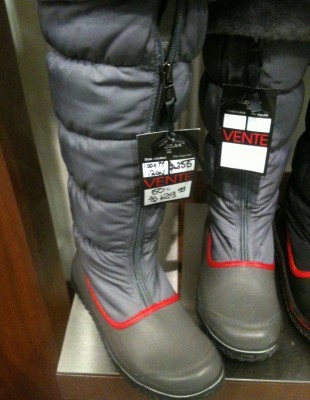 Pour celles qui ont besoin de bottes d’hiver chaudes ou de cuir, un arrêt au Rudsak est fortement recommandé. Les bottes y sont jolies et doublement en solde, déjà réduites et on y ajoute 30 % de rabais supplémentaire. Voici quelques modèles attrapés au vol avec mon iPhone…