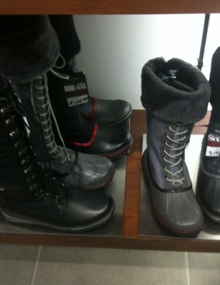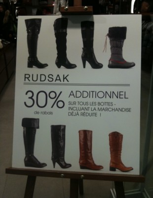 Pour celles qui ont besoin de bottes d’hiver chaudes ou de cuir, un arrêt au Rudsak est fortement recommandé. Les bottes y sont jolies et doublement en solde, déjà réduites et on y ajoute 30 % de rabais supplémentaire. Voici quelques modèles attrapés au vol avec mon iPhone…