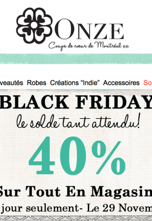 Finalement, il y a un solde fou pour le black Friday chez Onze, tout sera à 40% de rabais, en magasin et en ligne (surveillez-bien les conditions) avec le code: WOW40!