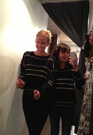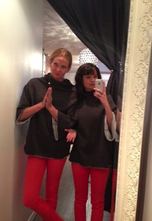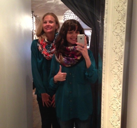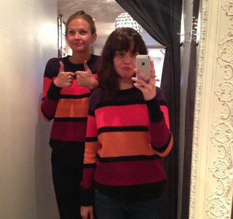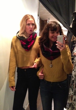 J’adore le pull multicolore minkpink mais il ne m’allait pas bien, surtout en le voyant dans toute sa gloire sur Mélodie. Quand c’est le temps de parler de pull, c’est Mélodie qui l’emporte, j’ai besoin de plus de structure dans mes vêtements pour ne pas avoir l’air d’une petite poche de patates. C’est pas mal la moral de cette cabine, vous pouvez le voir avec ma mine déconfite! On a beaucoup aimé les foulards infinis de JJLouis, ils sont doublés de tricot d’un côté et si jolis de l’autre :)