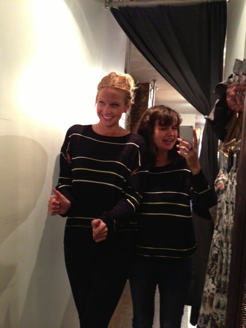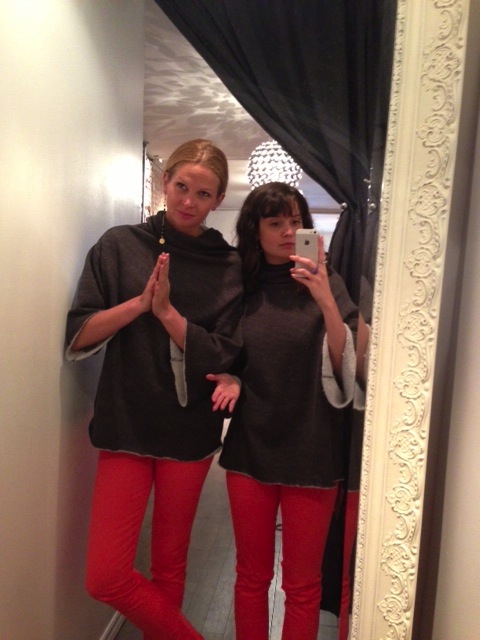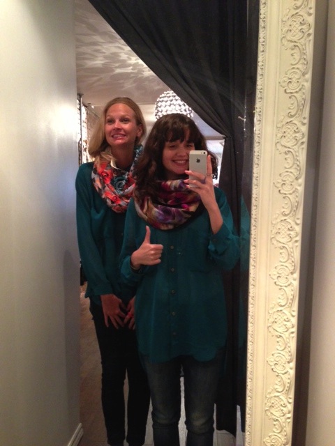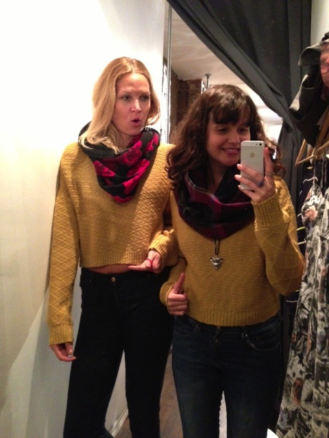 J’adore le pull multicolore minkpink mais il ne m’allait pas bien, surtout en le voyant dans toute sa gloire sur Mélodie. Quand c’est le temps de parler de pull, c’est Mélodie qui l’emporte, j’ai besoin de plus de structure dans mes vêtements pour ne pas avoir l’air d’une petite poche de patates. C’est pas mal la moral de cette cabine, vous pouvez le voir avec ma mine déconfite! On a beaucoup aimé les foulards infinis de JJLouis, ils sont doublés de tricot d’un côté et si jolis de l’autre :)