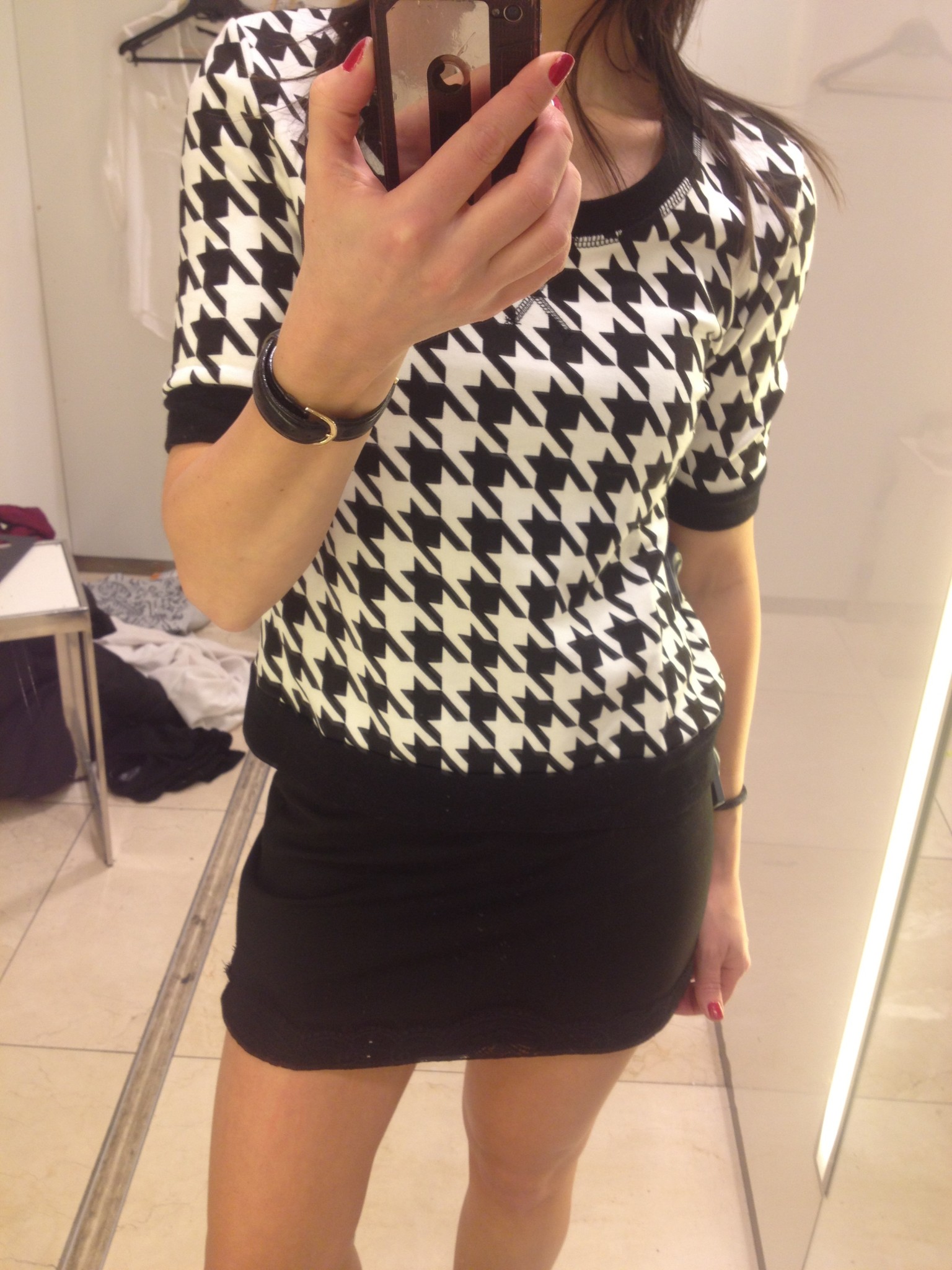 Je me suis aussi procuré la robe noire, le T-shirt Nouveau Punk et le pull imprimé pied de poule. Et je me suis laissé tenté par des collants brillants et à pois à seulement 9$.