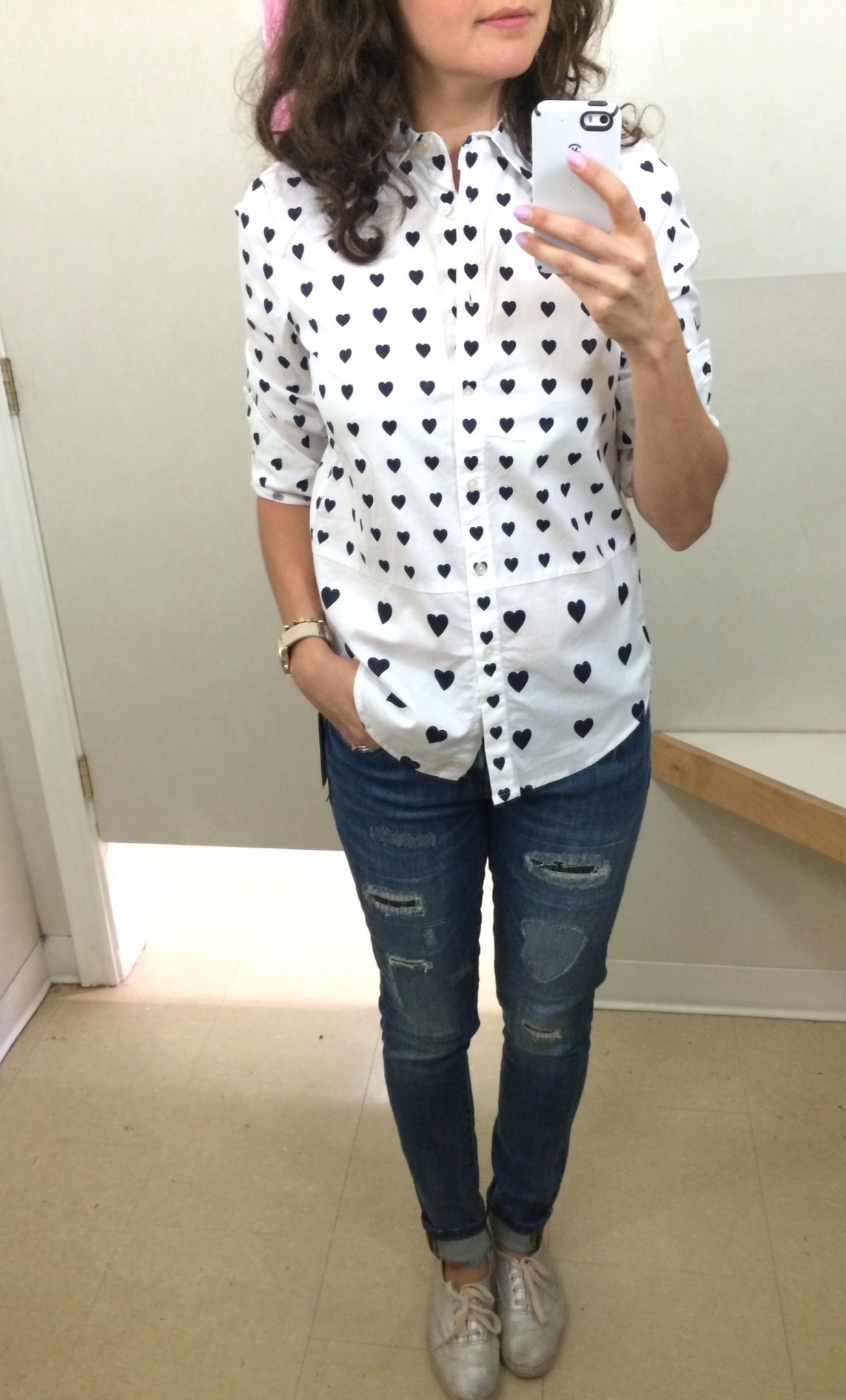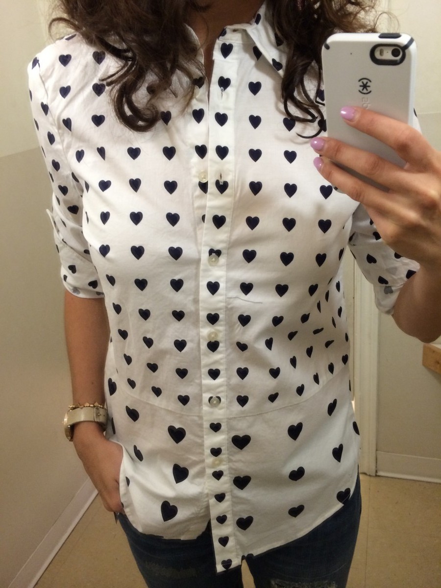 Mon préféré de tous : le chemisier de coton avec des coeurs… qui ajoutera une petite dose de bonheur à tous vos looks car il s’enfile super bien en dessous de tricots unis ou à rayures.