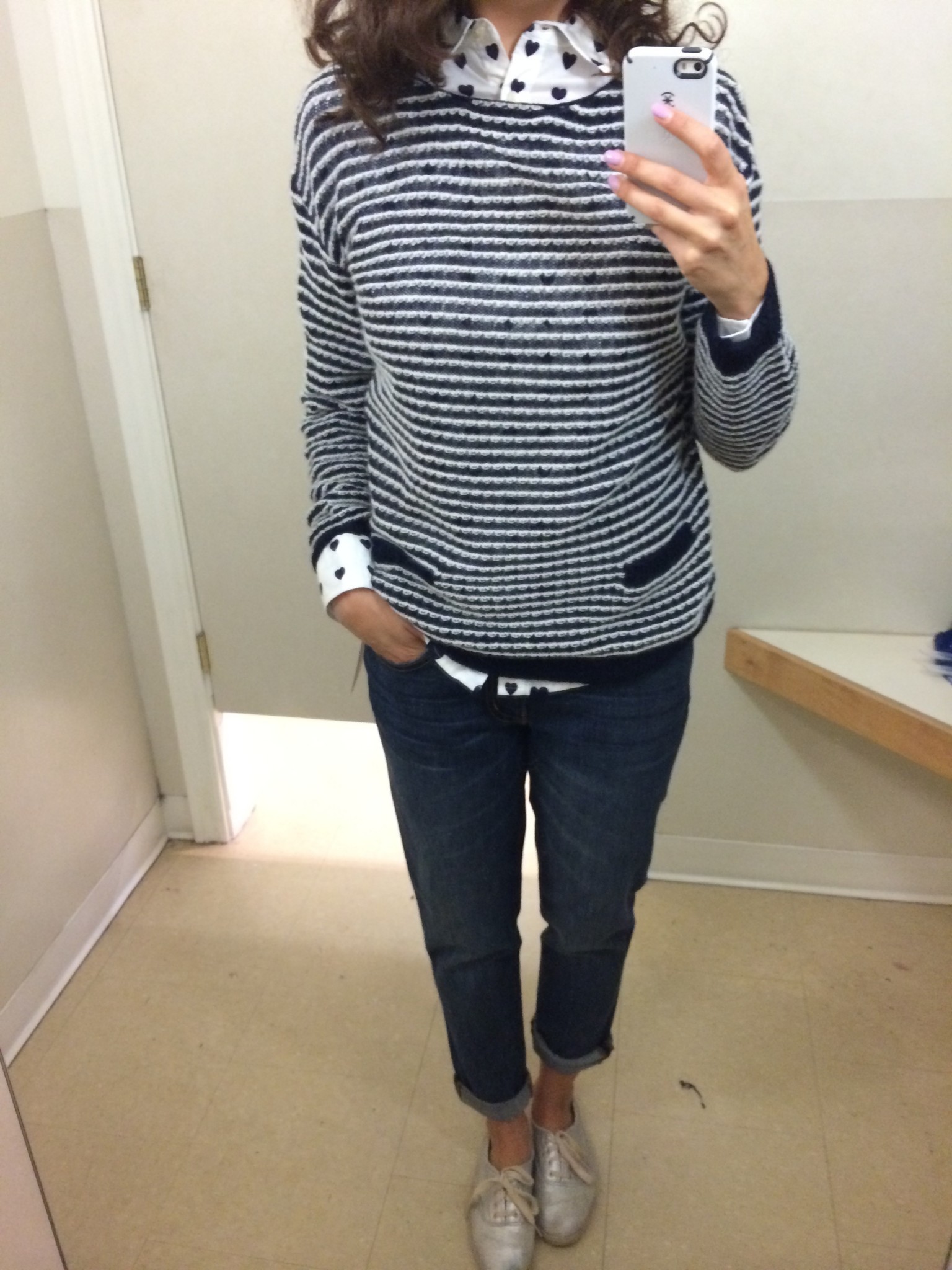 Je me suis donc rendue au Joe Fresh coin Cavendish pour aller essayer des chemisiers. A ma grande déception, les chemises à carreaux ne sont pas encore en stock (ni en ligne, alors je me demande même si j’ai halluciné avec le sudafed) mais j’ai quand même trouvé qqs morceaux digne d’une cabine.
