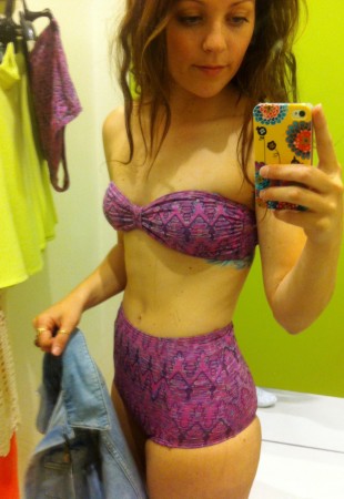 3- La grande primeur de Dans la cabine ce mois-ci est l’Opération camouflage muffin-top. J’ai donc testé un maillot de bain taille haute pour vous, chères lectrices. Le verdict s’avère positif, comme quoi j’ai adoré l’effet taille haute, bien que le haut de ce modèle est plus ou moins flatteur.