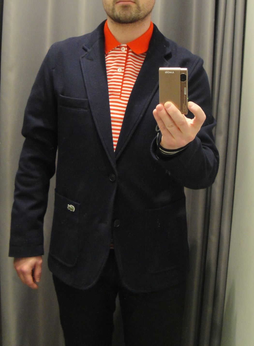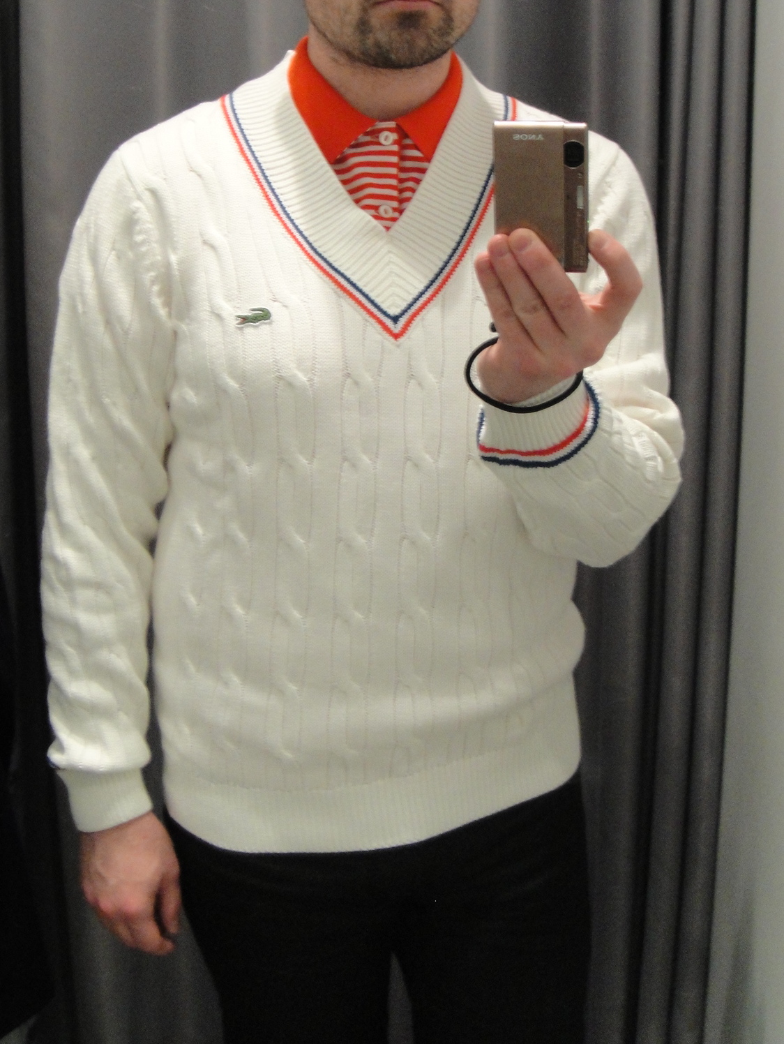 Au 2e étage de la boutique Lacoste Montréal se trouve la collection Live! Haute en couleurs et en imprimés, il y a des polos, hoodies, sneakers, mais aussi vestons, chemises et accessoires. Cette gamme propose des coupes plus cintrées tout en gardant un côté décontracté. Qui dit Lacoste, dit nécessairement tennis, donc j’ai pensé vous proposer 2 looks pour assister à la prochaine Coupe Rogers. En arrivant, à l’étage, j’ai tout de suite repéré ce veston bleu foncé avec ses revers à rayures blanches ( 350,00 $ ). Il est chic et sport à la fois, puis en l’agençant avec un polo, on se la joue fan de tennis au max! Pour ce qui est du pantalon, je n’oserais pas suggérer un khaki blanc, mais plutôt de couleur gris qu’on peut porter avec mocassins en cuir comme ce modèle Sperry Top Sider ( 110,00 $ ) de chez Little Burgundy. Pour le 2e look, j’ai gardé le même polo à rayures orange ( 115,00 $ ) et j’ai troqué le veston pour un pull col V blanc ( 195,00 $ ). Si le soleil peut se décider à se pointer, le pull risque d’être un peu trop chaud, alors vous le placerez nonchalamment sur vos épaules. Même si un jean semble parfait pour ce look, allez-y pour pantalon de coton vert émeraude ou bleu marin tout simplement. Pour terminer, pourquoi ne pas essayer ce soulier richelieu de chez John Fluevog ( 265,00 $ ) ? À bientôt! Patrick L’Aristocrate