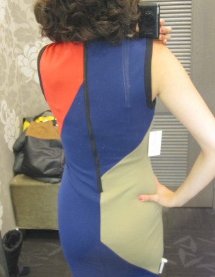 Suivi de près par la robe “color-blocking” à 129 $ (qui sera d’ailleurs portée par Marie-Soleil Michon lors de l’émission La Liste du 27 janvier – scoop), la robe drapée multicolore (qui camoufle le petit ventre) à 139 $ et l’ensemble tricot et jupe à respectivement 89 $ et 109 $.