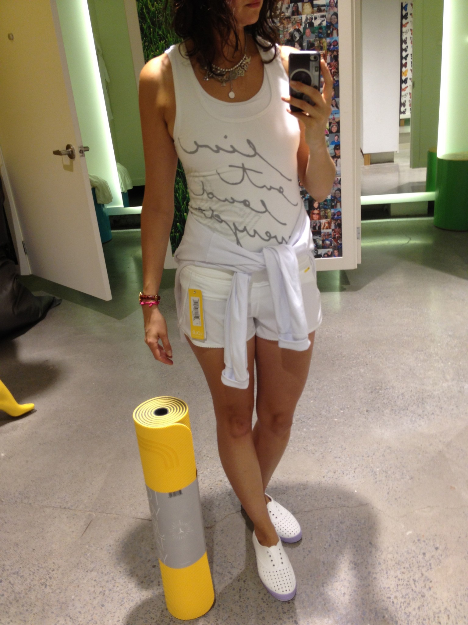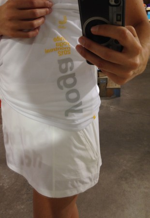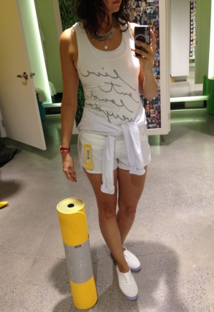 2) Short et camisole moulante + une camisole un peu moins ajustée pour camoufler les petits défauts révélés par la cami moulante. Et j’adore le petit hoodie blanc… si jamais il fait froid le 28 juillet