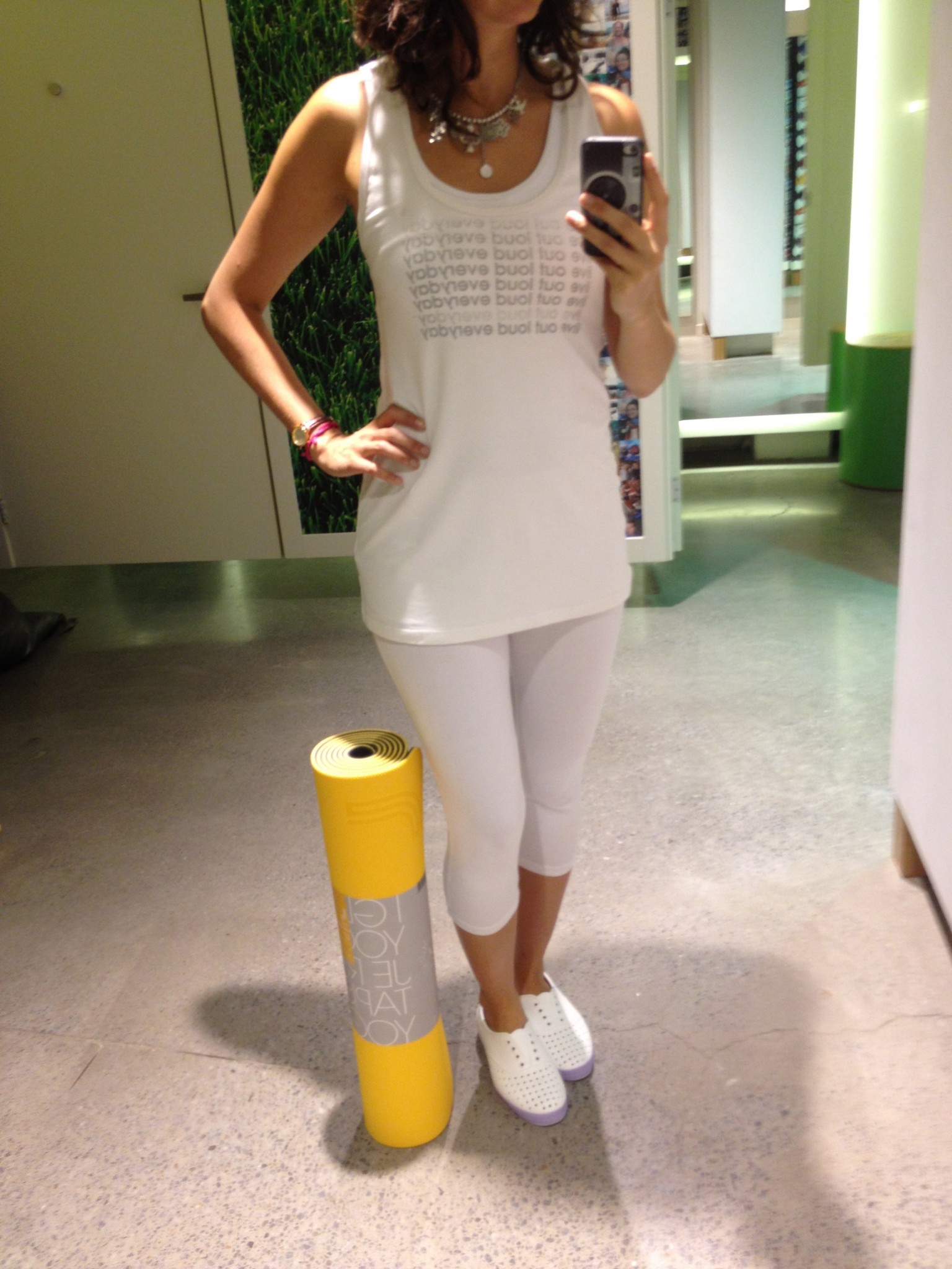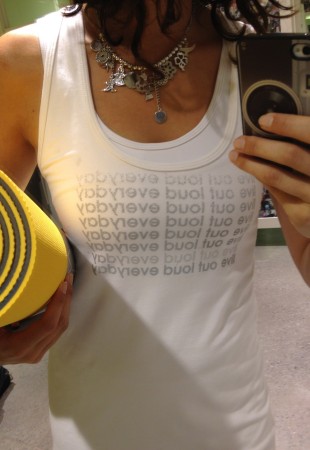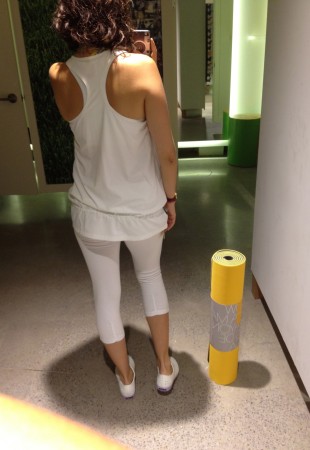 3) Le capri blanc est l’option la moins dispendieuse (40 $). Il est un peu transparent donc je recommande de le porter avec une camisole longue qui arrive sous les hanches. J’aime particulièrement la première camisole (modèle jump) pour sa taille coulissante. On la porte par-dessus un soutien-gorge sport ou une camisole avec soutien intégré.