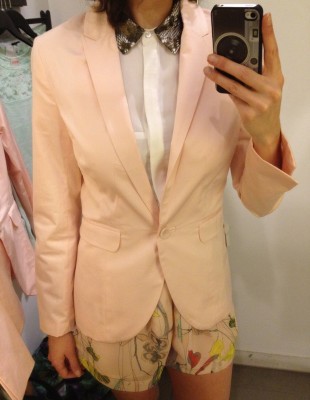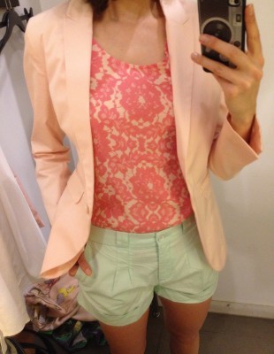 – de l’ensemble : veston rose pâle magnifique à 35 $, haut corail et rose à 20 $ et du short vert menthe à 20 $