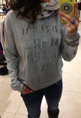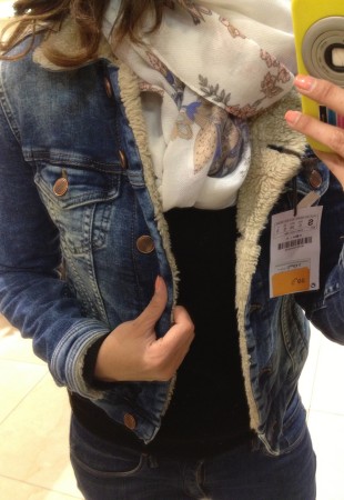 J’ai été bien tentée par le petit jacket de jeans doublé de mouton qui me rappelle vaguement un manteau que j’avais à l’adolescence et séduite par le confort du coton ouaté gris.