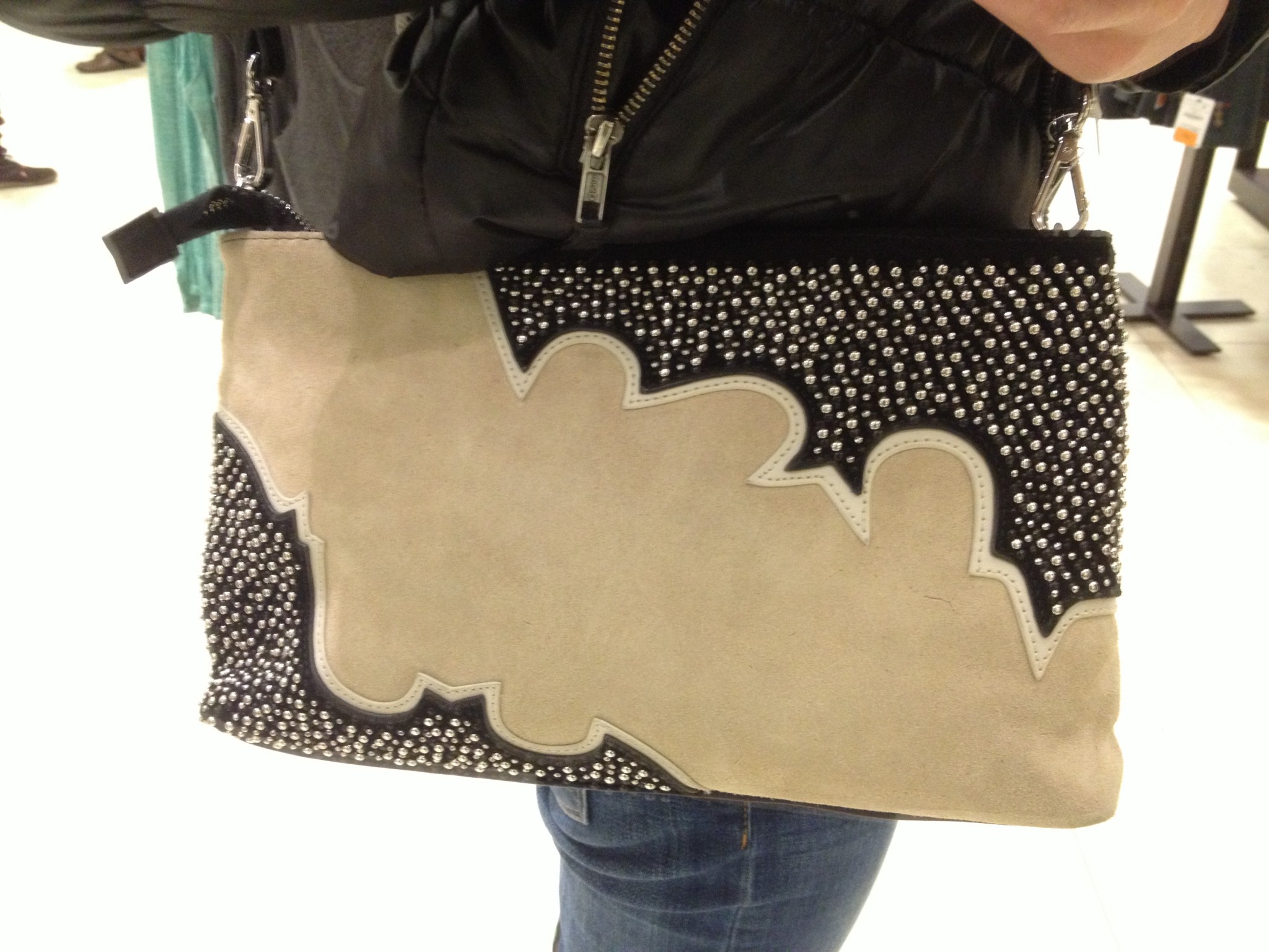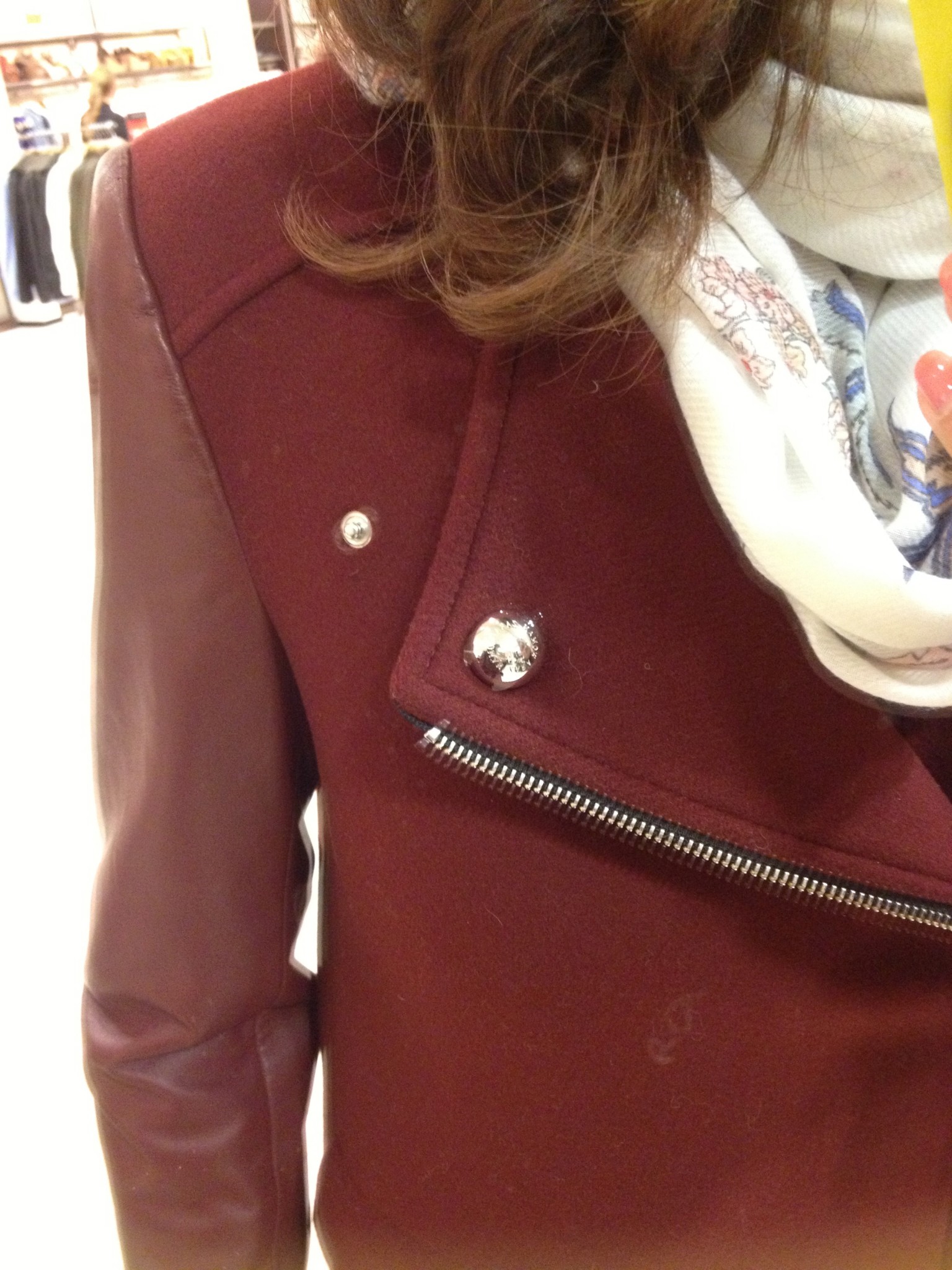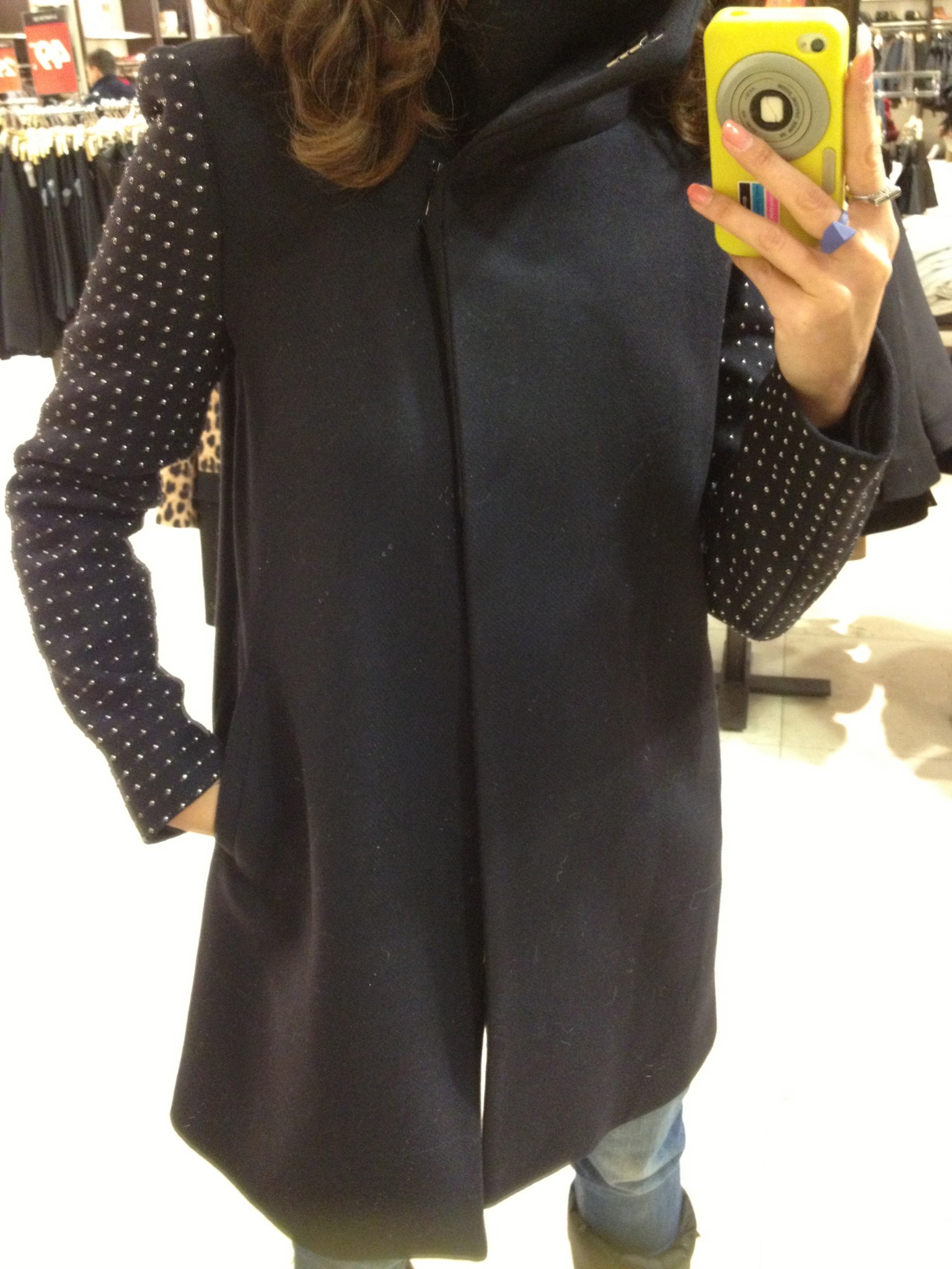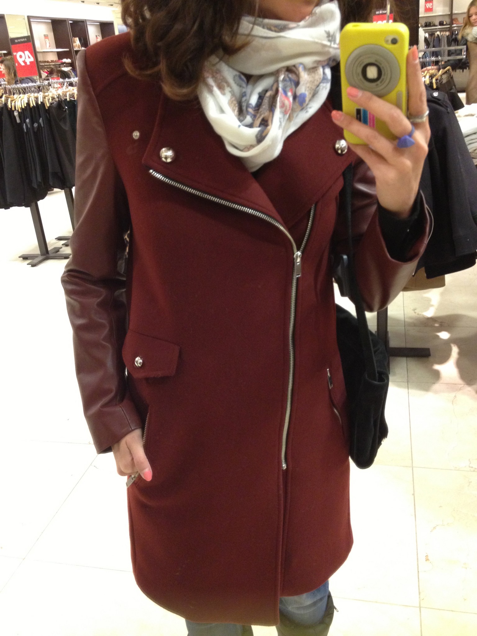 Comme à l’habitude, les sacs sont magnifiques et bien soldés, mon préféré, le noir en suède avec studs est en solde à 79,99 $. Ensuite du côté des manteaux, j’ai bien aimé le marine avec les billes décoratives au bras même s’il était un peu grand (M et plus seulement à ce Zara), il est aussi disponible et fort joli en kaki. Le bourgogne est un peu moins dans ma palette mais je l’imagine bien ce joli manteau aux bras en cuir sur une jolie blonde. Les deux sont à 139,99 $.