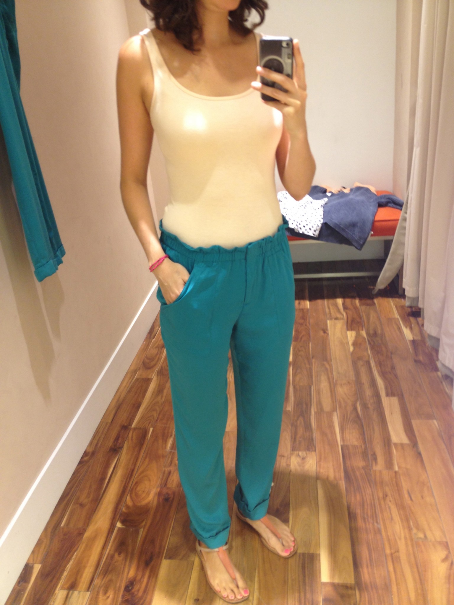 – le pantalon émeraude, clairement magnifique mais à la taille élastique si grande qu’un tour chez la couturière est obligatoire. En solde à 80 $ et 100 % polyester, j’ai jugé que ce n’était peut-être pas mal meilleure affaire.