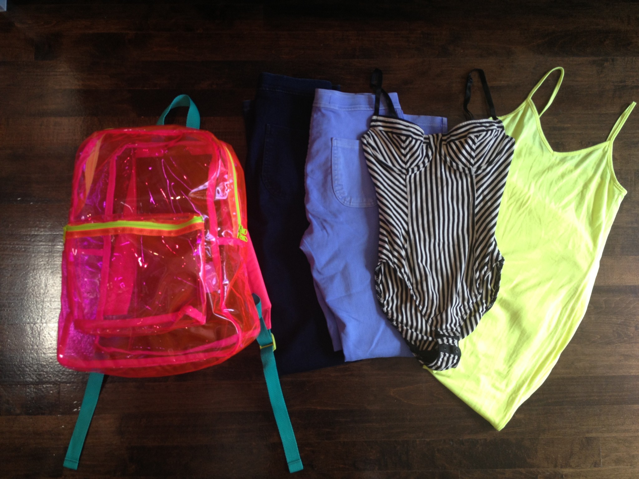 J’ai acheté 2 paires easy-jeans à la taille bien haute pour pouvoir porter des chemises nouées + des cropped tops, un body rayé noir et blanc, une maxi robe jaune et un sac à dos rose transparent pour jouer à l’éternelle adolescente cet été. Tout ça pour moins de 150 $. Les prix sont bons