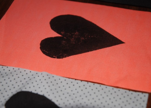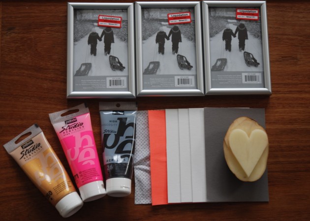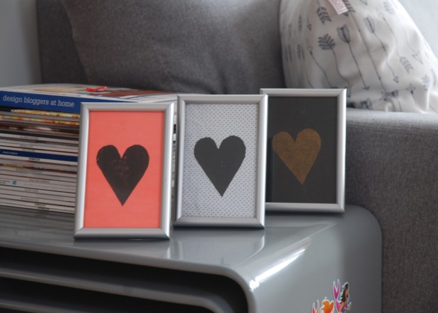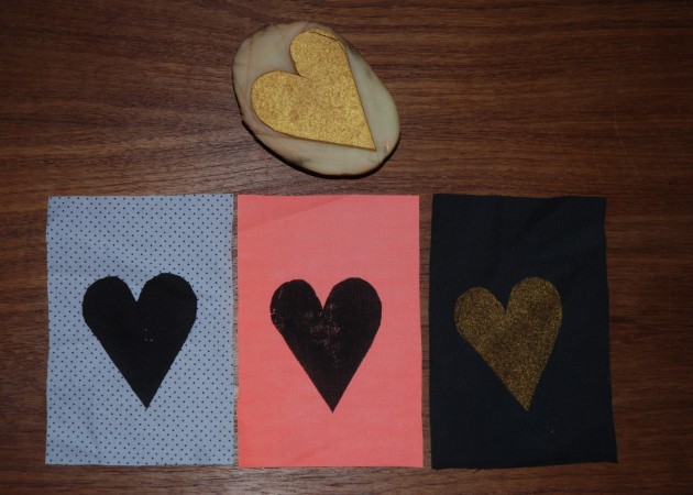 Je me suis dit que ce serait simple à réaliser. Pourquoi ne pas décliner l’idée en 3 petits cadres sur fond de retailles de tissus tout simplement étampé d’un coeur noir ou doré pour un look plus actuel. J’ai fabriqué mon étampe à l’aide d’une patate. Couper la patate en deux et tracer le contour de la forme désirée à l’aide d’un petit couteau ou d’un crayon pour les moins confiant. Utiliser ensuite un petit couteau pour enlever la patate non nécessaire autour de la forme désirée. Cette dernière sera donc surélevée et vous permettra de faire une jolie étampe sur votre surface.