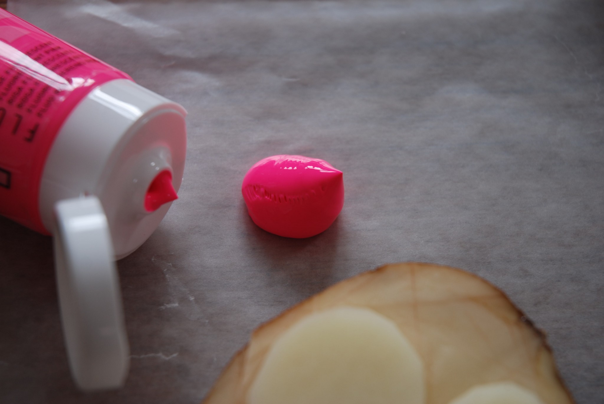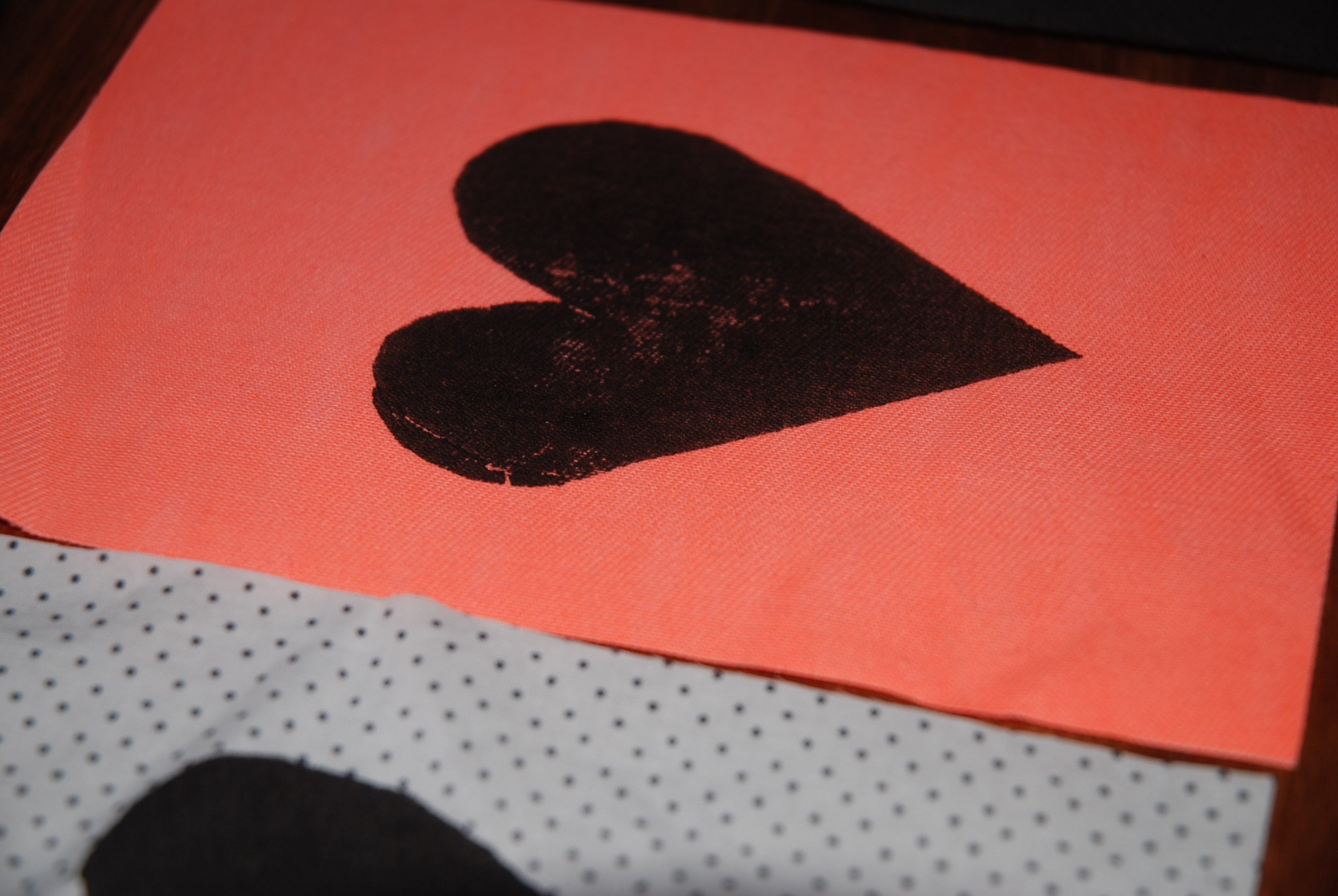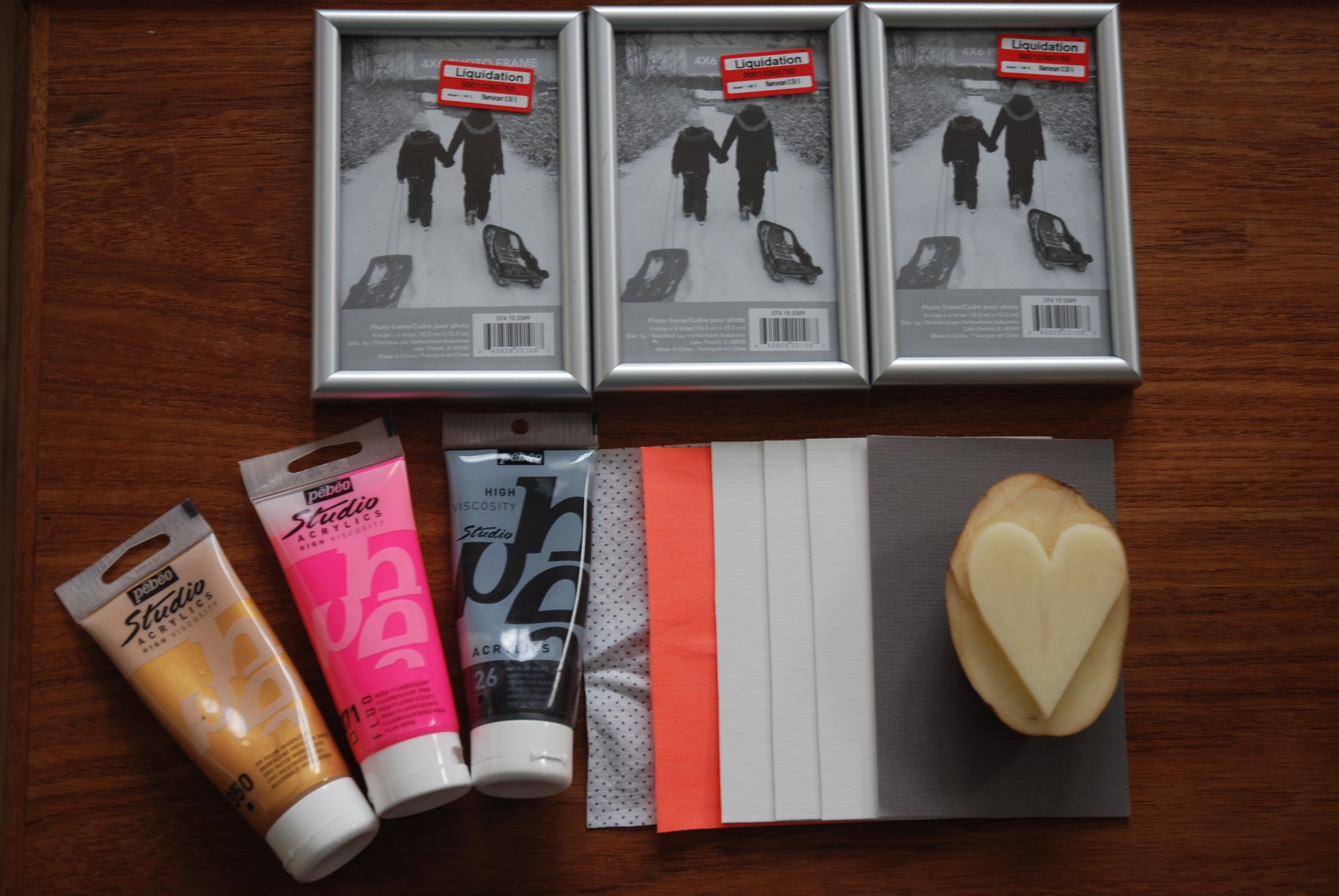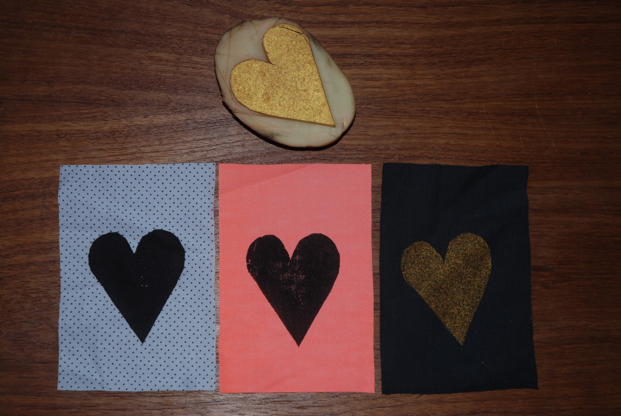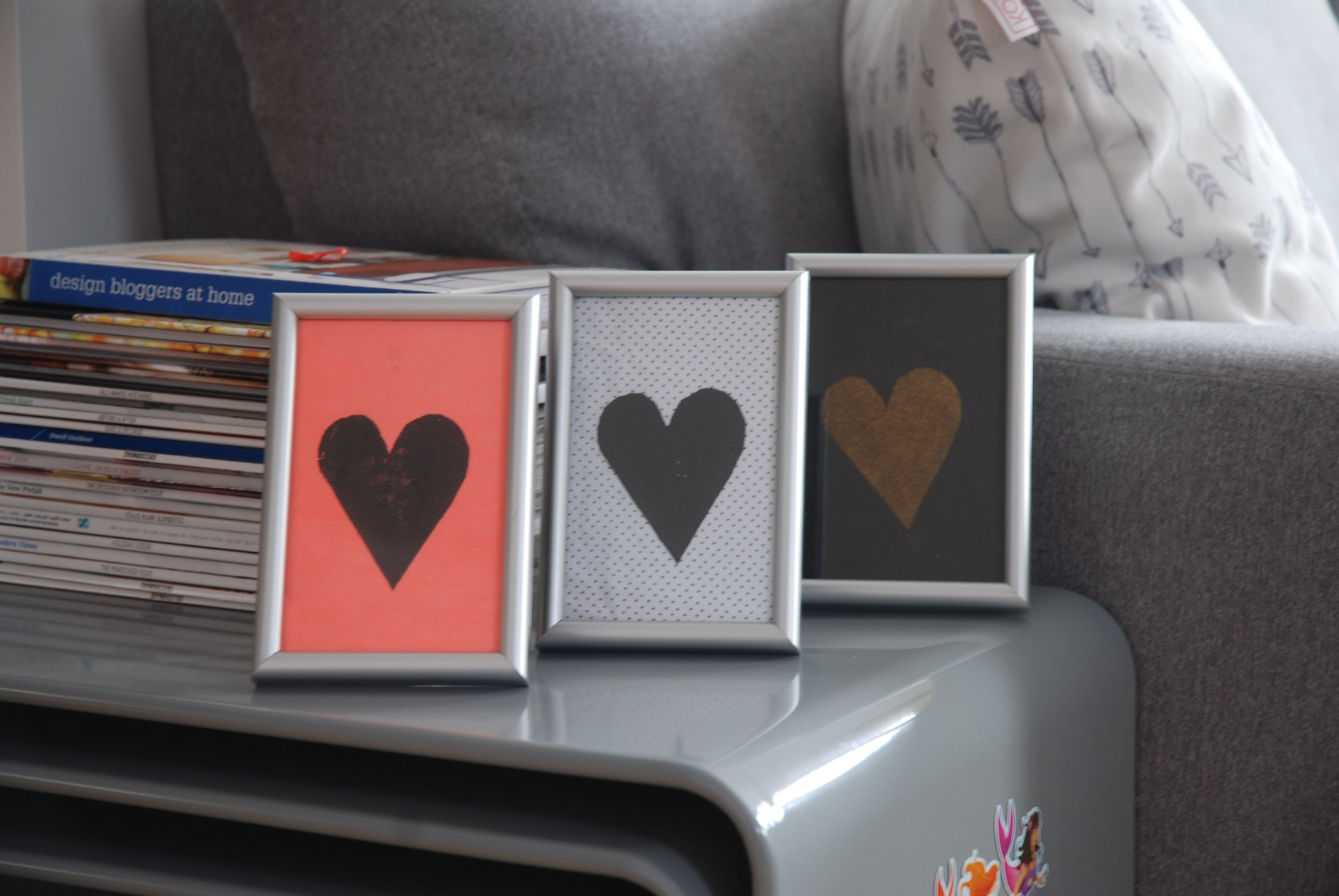 Je me suis dit que ce serait simple à réaliser. Pourquoi ne pas décliner l’idée en 3 petits cadres sur fond de retailles de tissus tout simplement étampé d’un coeur noir ou doré pour un look plus actuel. J’ai fabriqué mon étampe à l’aide d’une patate. Couper la patate en deux et tracer le contour de la forme désirée à l’aide d’un petit couteau ou d’un crayon pour les moins confiant. Utiliser ensuite un petit couteau pour enlever la patate non nécessaire autour de la forme désirée. Cette dernière sera donc surélevée et vous permettra de faire une jolie étampe sur votre surface.