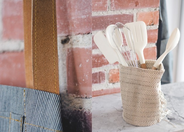 – des ustensiles de cuisine (West Elm) joliment rangés dans une corbeille fait main par Sainte Marie Design Textile 70$