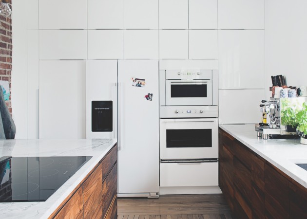 Petit conseil déco #1 : Afin de respecter votre budget cuisine, je vous conseille d’opter du IKEA en majorité. Les charnières et les tiroirs à extension complète bénéficient d’une garantie de 25 ans. De plus les amortisseurs des portes et tiroirs fonctionnent super bien. Nous avons misé sur des caissons IKEA pour la totalité des armoires, un fini thermoplastique IKEA pour le mur blanc ainsi qu’un frigo, four micro-ondes et four IKEA. Attendez le solde des cuisines qui a lieu 2 fois par an afin de maximiser vos économies. Comme nous désirions un fini noyer pour les armoires du bas et qu’IKEA ne nous offrait pas ce que nous voulions, nous avons misé sur un ébéniste local pour les façades de noyer noir.