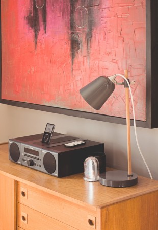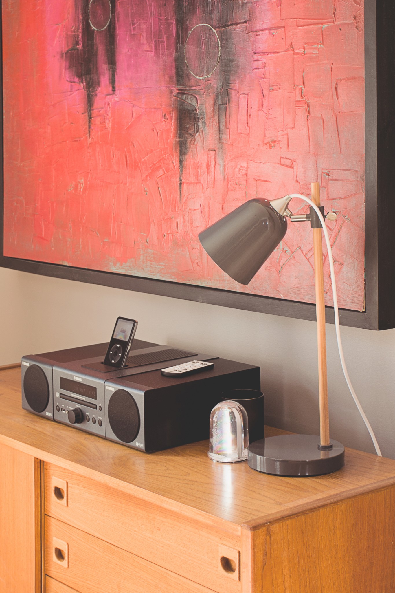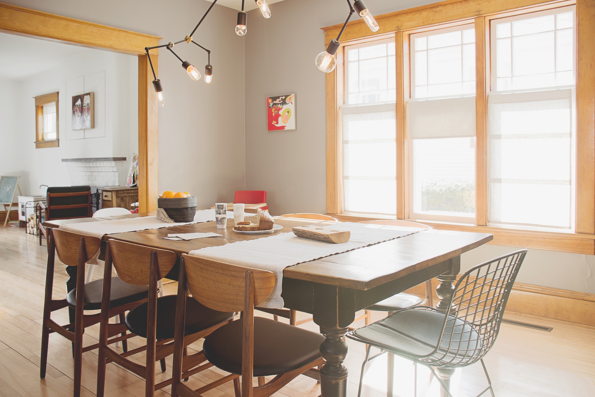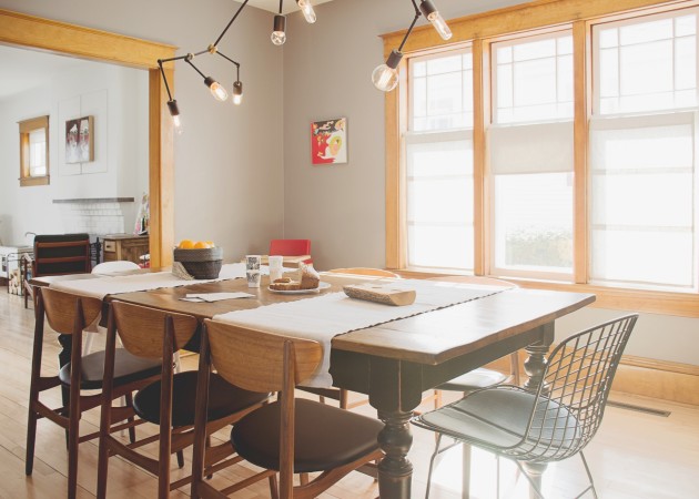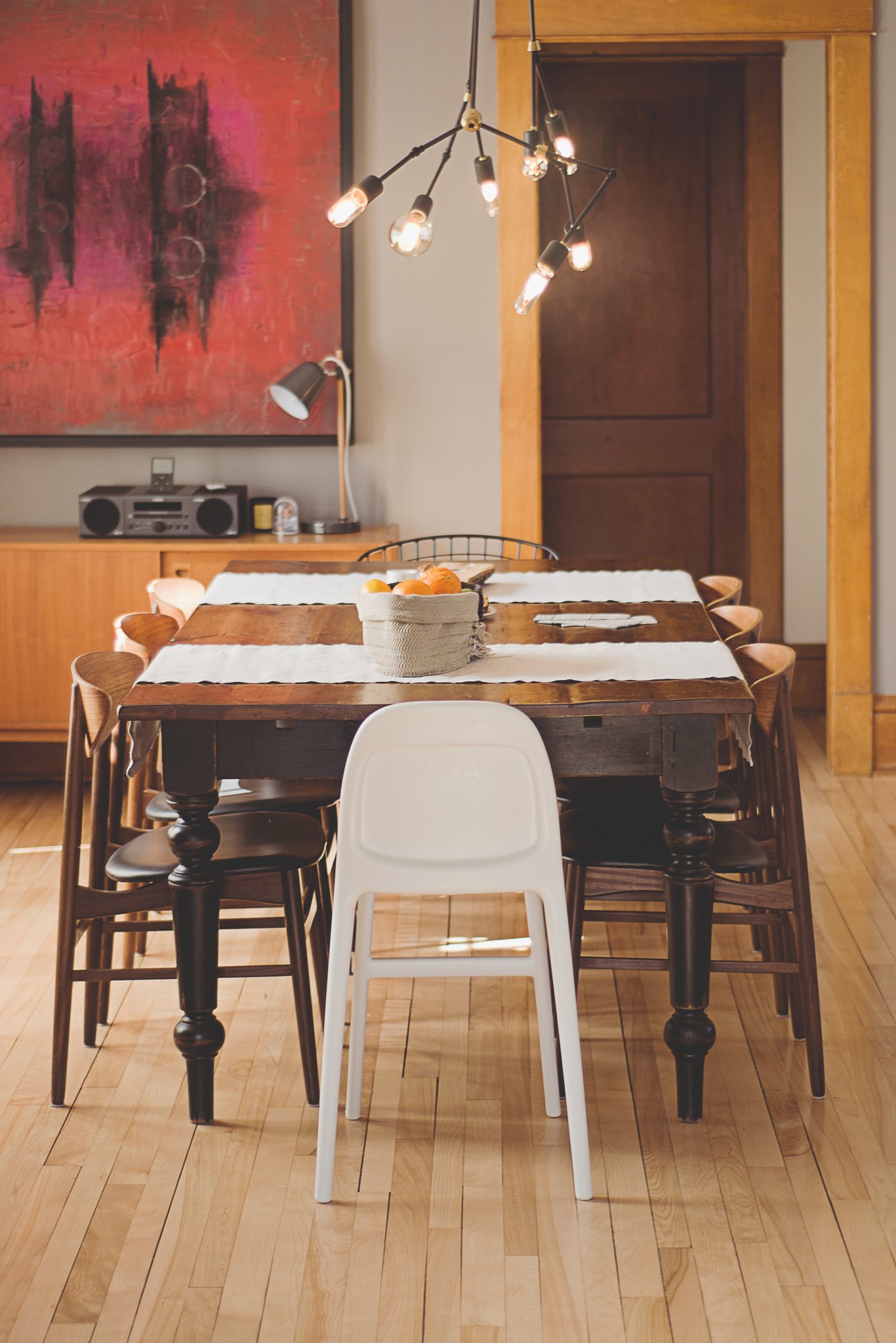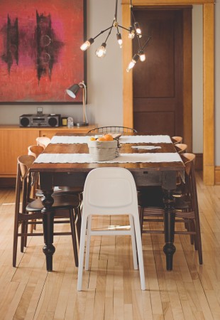 Pour la salle à manger, nous avons privilégié le bon dicton Keep it simple. Une couleur neutre assez foncée sur les murs afin d’ajouter un brin de réconfort, de jolies œuvres d’art et une grande table faite sur mesure par un antiquaire situé entre Drummondville et Québec. Comme la table ajoute déjà beaucoup de cachet à la pièce, je préfère toujours utiliser des napperons ou chemin de table plutôt qu’une nappe. Autour de la table, des chaises vintage au look scandinave dénichées rue Amherst qui se marient super bien avec la table.