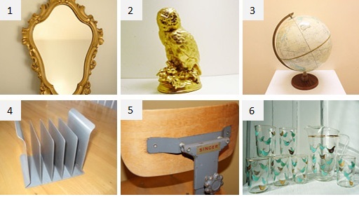 1) Miroir à 55 $ sur Etsy 2) Bibelot à 26 $ sur Etsy 3) Globe à 50 $ sur Etsy 4) Rangement à 5 $ sur Etsy 5) Chaise à 89 $ sur Etsy 6) Pichet et verres à 62 $ sur Etsy