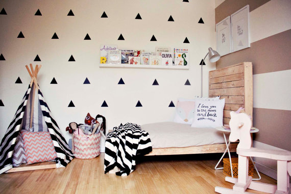 - Les autocollants muraux simples souvent de formes géométriques (Etsy ou la collection mpgmb de Adzif) ;