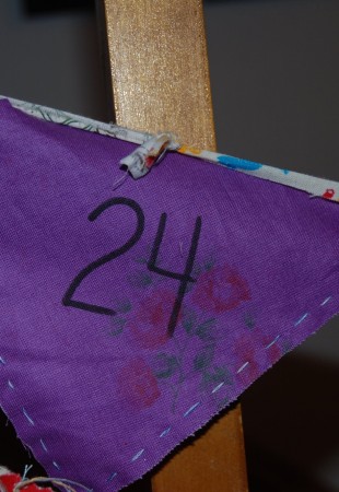 Étape 3: Inscrire les chiffre de 1 à 24 (ou 25 si vous désirez faire durer le plaisir une journée de plus) sur les fanions. Utiliser un feutre pour tissu ou un simple feutre de la couleur de votre choix. Je vous suggère de placer une feuille à l’intérieur de votre pochette fanion afin d’éviter que votre feutre passe de l’autre côté.