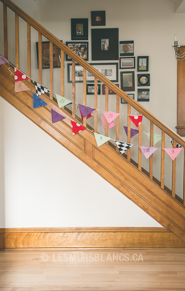 L’an dernier j’ai créé mon premier calendrier de l’avant, pour Cécile évidemment, afin de rendre le décompte des dodos avant l’arrivée de Santa Claus encore plus amusant. Je me suis inspirée des banderoles à fanions que j’aime tant. Mon calendrier a donc un double usage et a une durée de vie beaucoup plus longue. Il suffit de lui faire faire demi-tour afin de cacher le chiffre annonçant le décompte avant Noël et ainsi profiter d’une jolie banderole qui donne du ton à mon escalier.