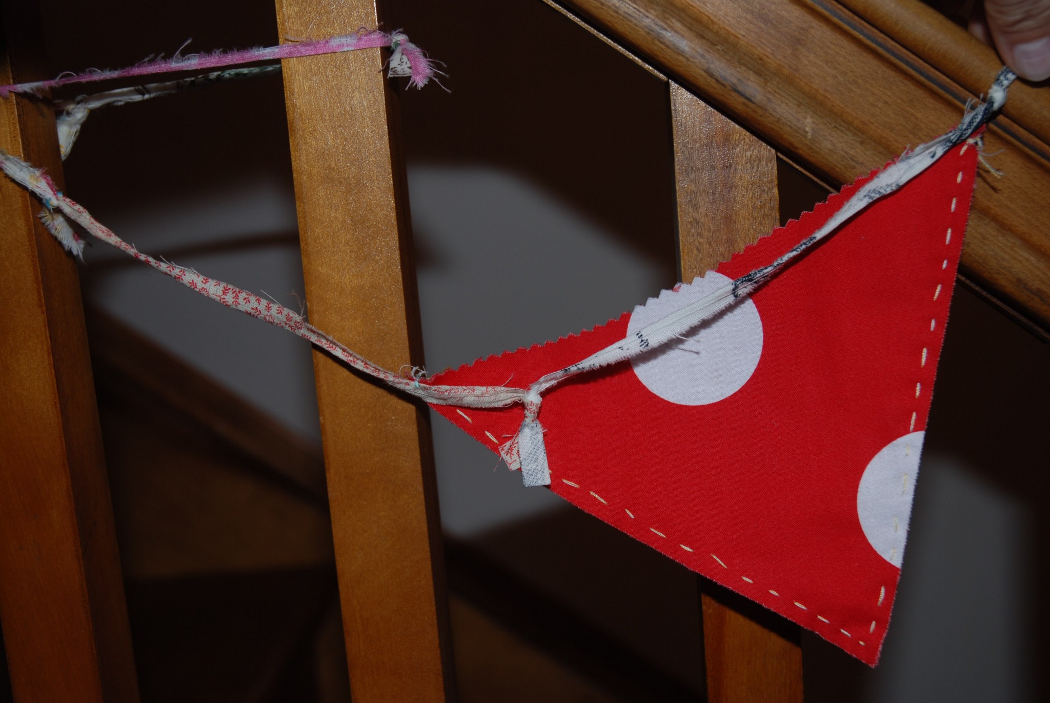 Étape 4: J’ai choisi d’assembler mes fanions avec des bouts de tissus (retailles) que j’ai déchiré manuellement. Je les ai ensuite noué un à la suite des autres et j’ai fait un point de couture pour fixer le fanion à ma corde (bout de tissu noué les uns aux autres). Si vous avez une machine à coudre, vous pourriez décider de prendre un biais pour assembler vos fanions les uns à la suite des autres.