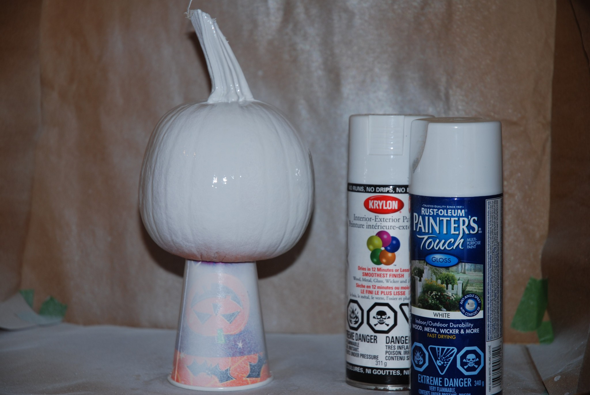 2. Appliquer le blanc mat directement avec le flacon original et son bouchon. Faire le tour de la citrouille en prenant soin d’appliquer la couleur autour de la queue. Les coulisses se formeront d’elles-mêmes puisque ce type de peinture est plutôt liquide. J’ai utilisé de l’acrylique liquide pour la peinture décorative (Ceramcoat mais plusieurs autres marques dispos).