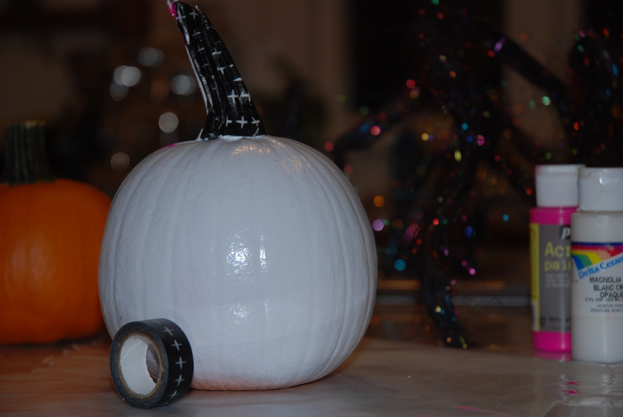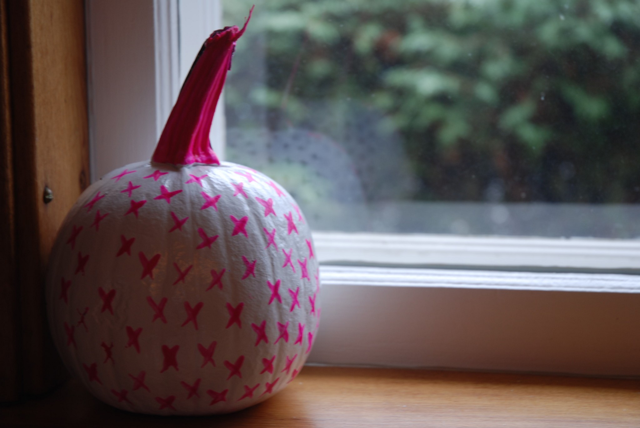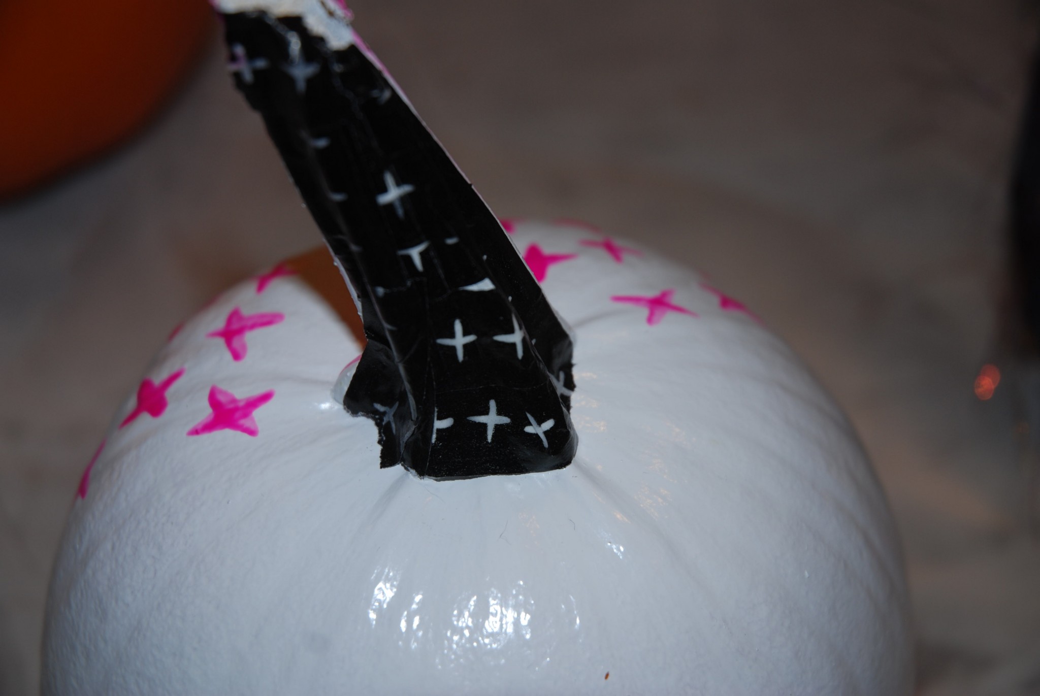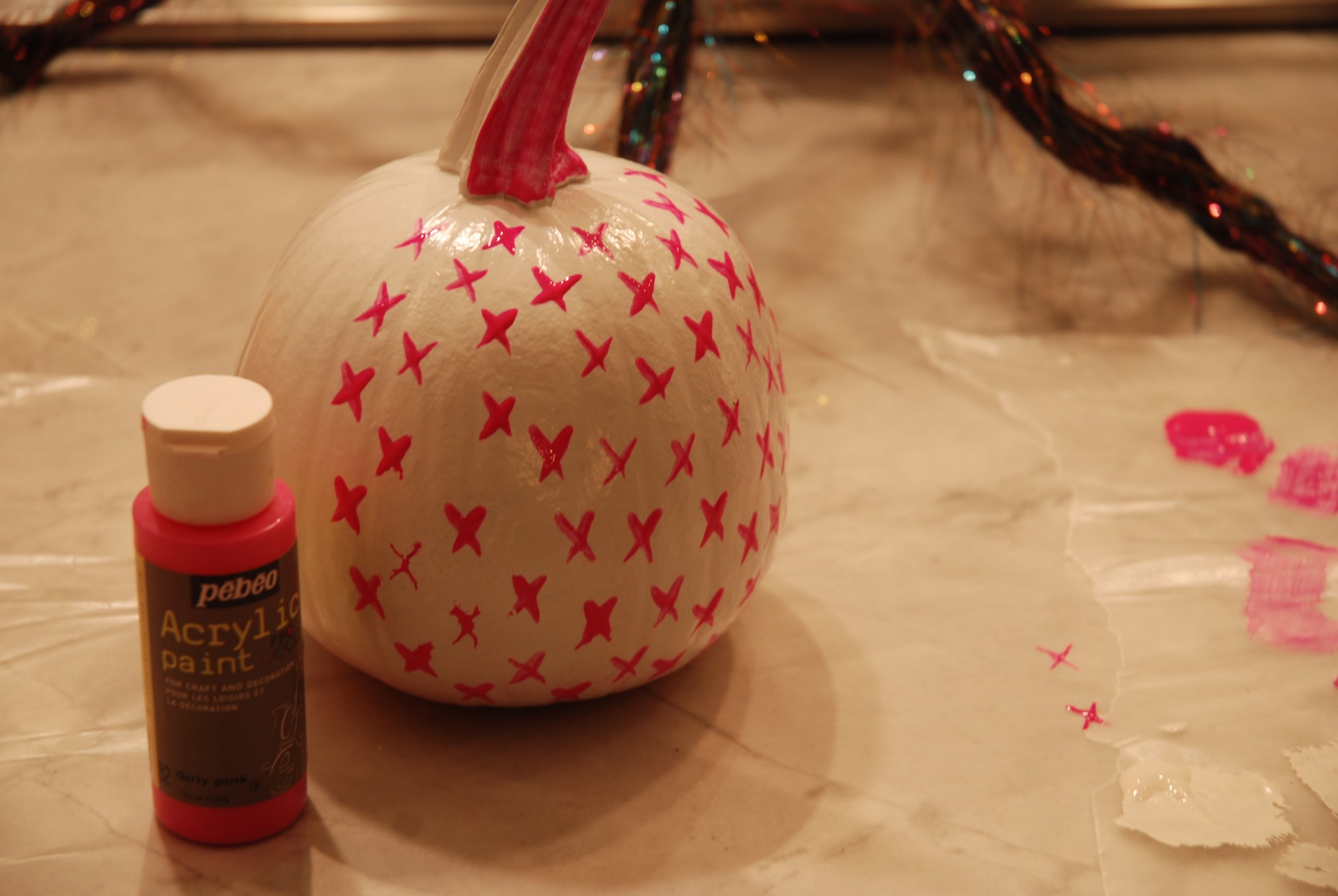 2. Pour les X j’ai utilisé une acrylique liquide pour peinture décorative de couleur rose fluo. Je voulais une citrouille plus éclatée et bien colorée. J’ai également peint la queue avec cette même couleur.