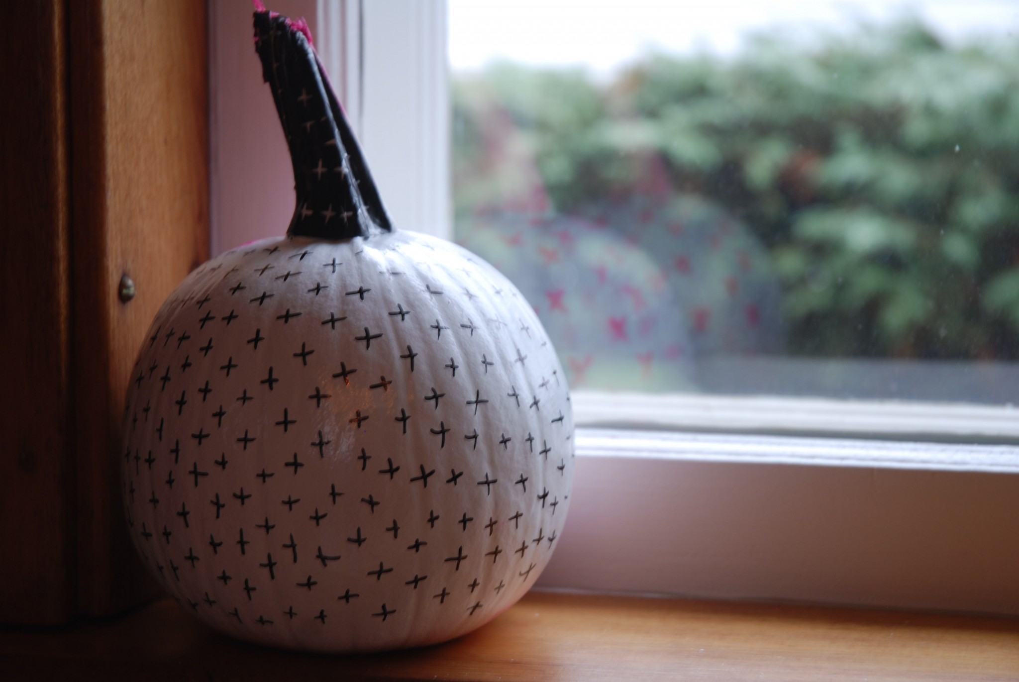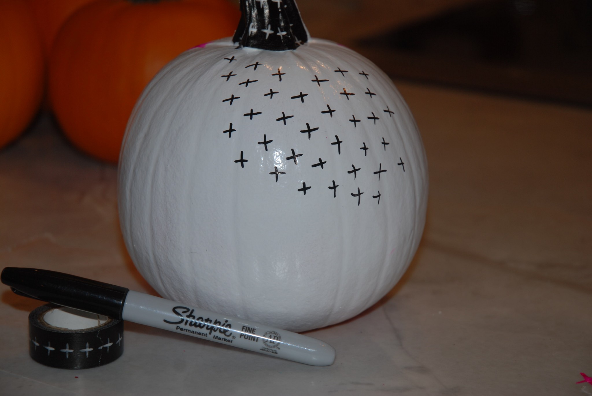 1. Pour cette dernière j’ai la même base que la citrouille avec X roses. Cette fois j’ai fait de petits + avec un feutre Sharpie noir. Vous auriez aussi pu utiliser une autre couleur de feutre selon vos envies. Ce type de feutre adhère super bien à la surface et le résultat sera super précis.
