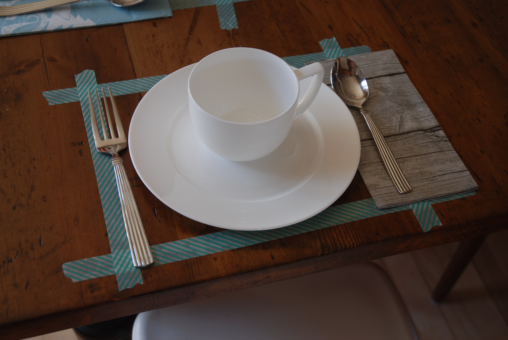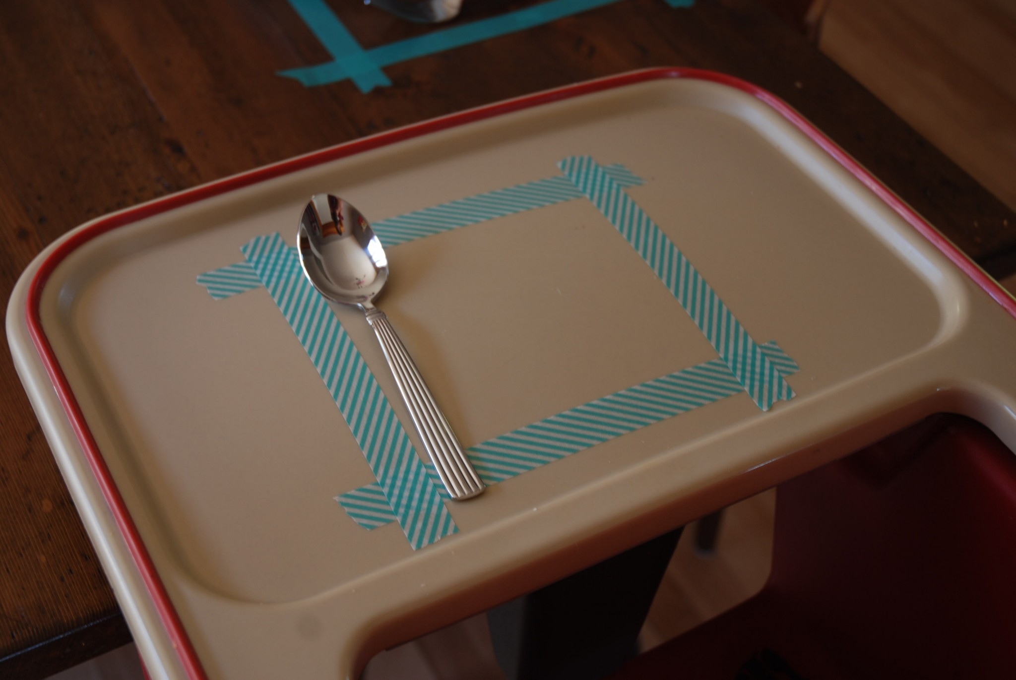 Choisissez votre washi tape favori et placez l’adhésif en forme de rectangle afin de former un napperon imaginaire. Ma petite Cécile a adoré et Simone a même eu le sien. En voyant celui de Simone sur le plateau de la chaise haute, Cécile s’exclame: mais c’est dont bien mignon :)