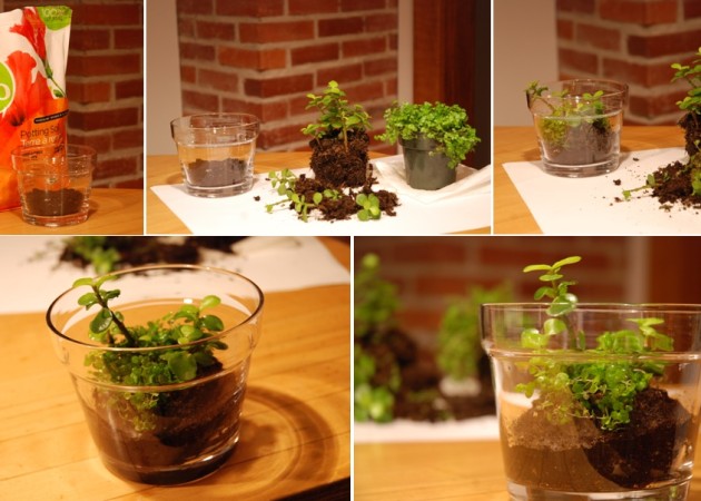 L’idée est de trouver un pot ou vase de verre pour bien laisser voir les petites plantes qui habiteront notre terrarium. Pourquoi pas le traditionnel pot mason qui redevient tendance. Un peu de terre de rempotage et quelques plantes au choix que nous devrons subdiviser en petit bouquet pour donner cet aspect minimaliste à notre terrarium. Il serait peut-être sage de placer quelques roches au fond pour faciliter le drainage.