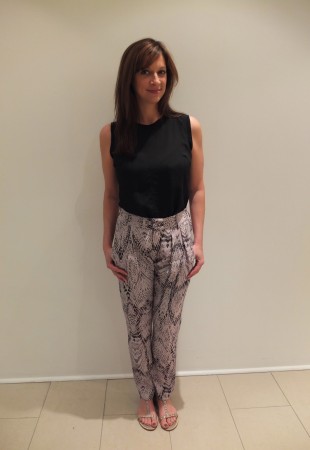 Look 5 : haut de soie noir 119 $ – pantalon de pyjama à imprimé serpent 159 $