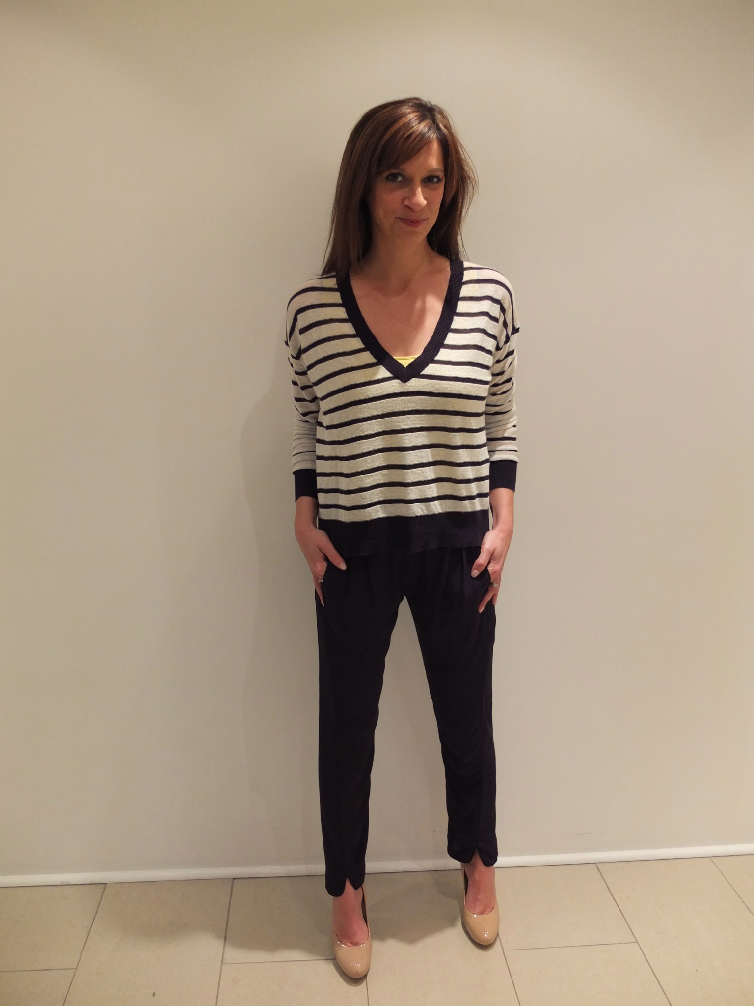 Look 3 : tricot marin 109 $ – camisole jaune 39 $ – pantalon 7/8 159 $