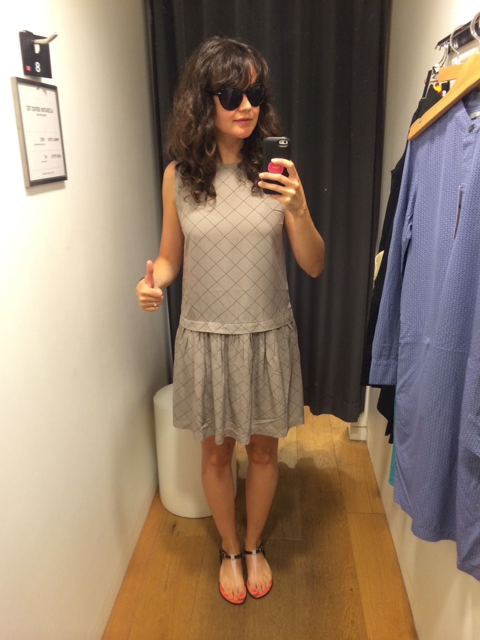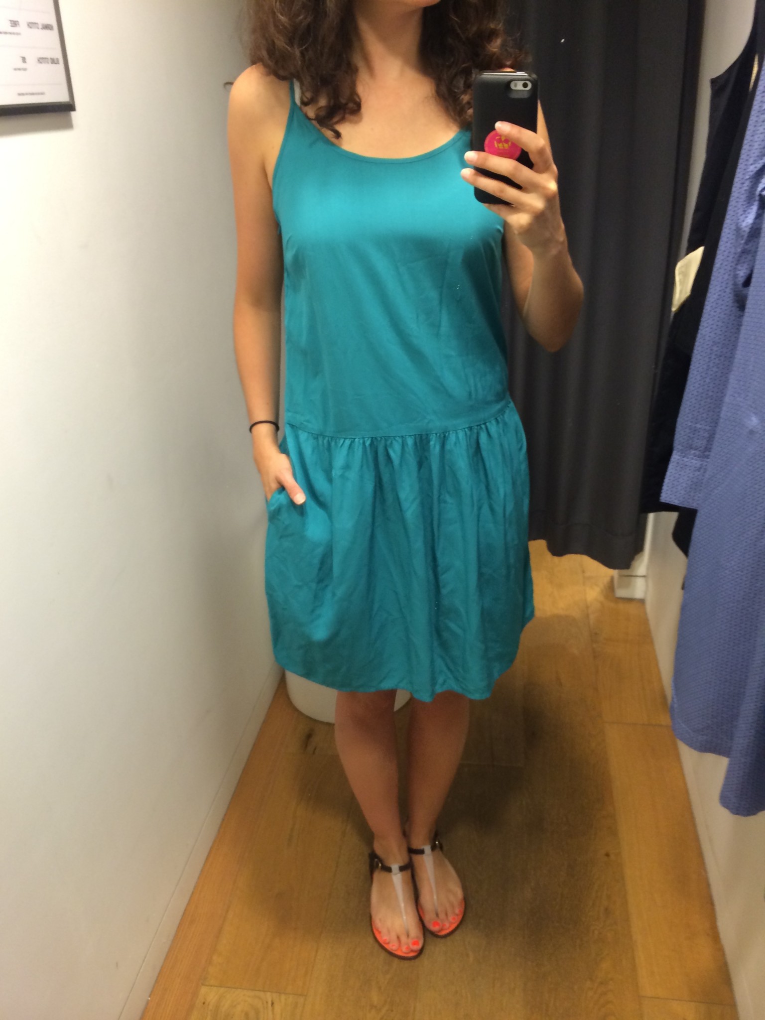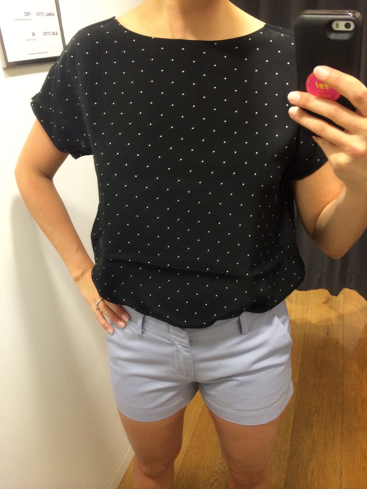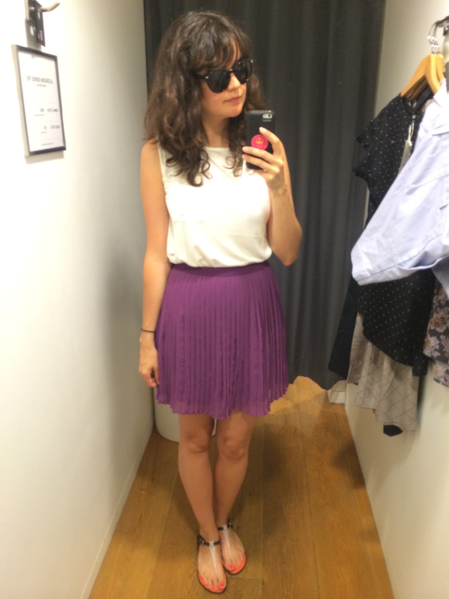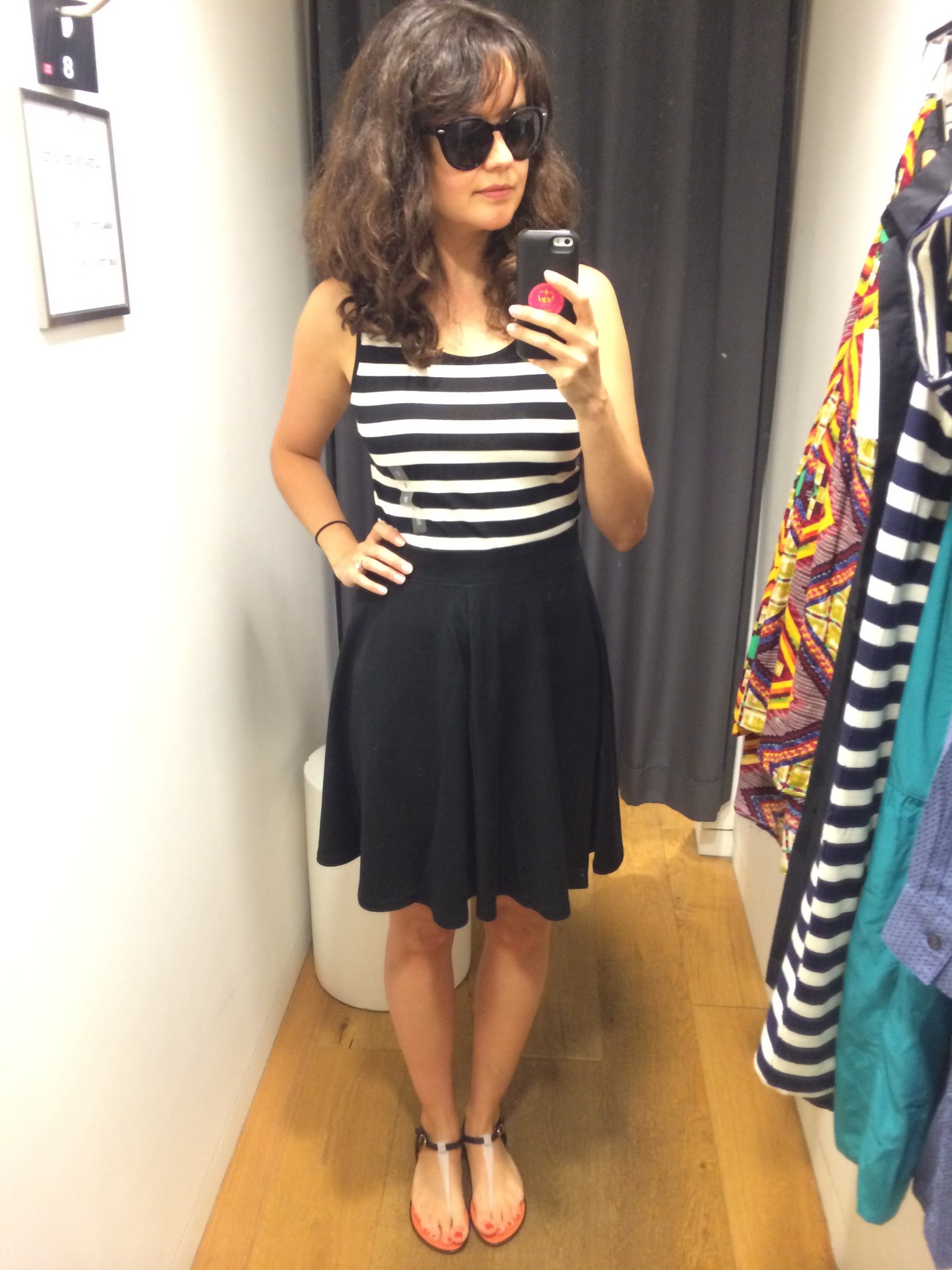 De retour à la cabine, je me suis retrouvée entre 2 tailles pour plusieurs morceaux cette fois-ci (vilaine mi-trentaine qui me guette). J’ai tout de même acheté quelques trucs : la cami rayée, la jupe circulaire noire en coton et la chemise hawaïenne. Et je regrette un peu le haut en soie tout simple à pois blanc. Oh well, ce sera pour une autre fois.